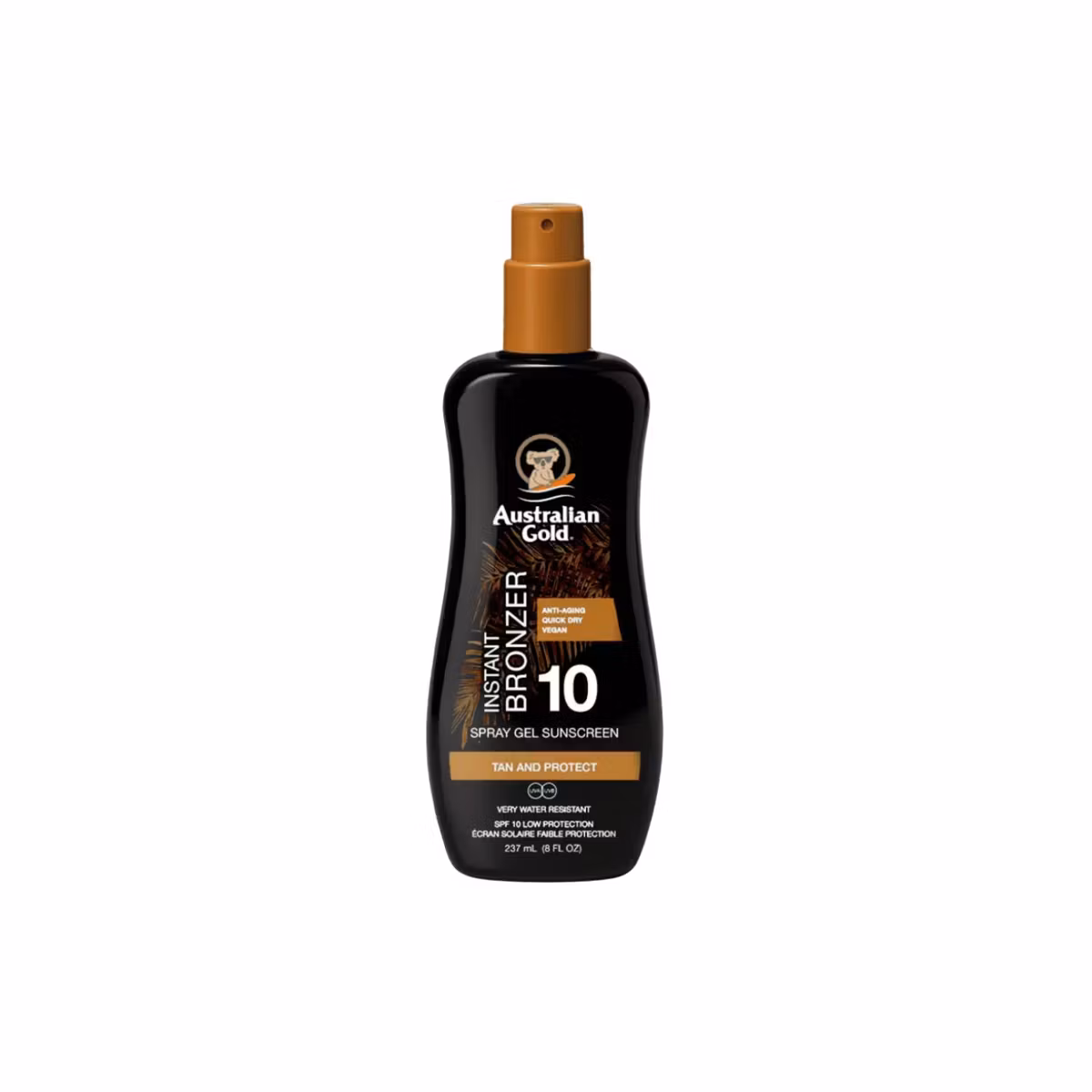 Australian Gold Instant Bronzer Spray SPF10 237ml X1 është një spray vetë-nxirës me mbrojtje diellore SPF10 që ofron ngjyrë bronzi të menjëhershme dhe një shkëlqim natyral për trupin , ideal për ata që duan një tan të bukur menjëherë dhe një dozë lehtë mbrojtjeje. Ky spray kombinon pigmente bronzuese të menjëhershëm me një dozë të lehtë mbrojtjeje SPF10, duke e bërë atë perfekt për përdorim kur dëshiron ngjyrë të dukshme pa ekspozim të gjate në diell. Formula e tij e lehtë shpërndahet në mënyrë uniforme me spërkatje, duke krijuar një pamje bronzi natyral dhe të lëmuar.