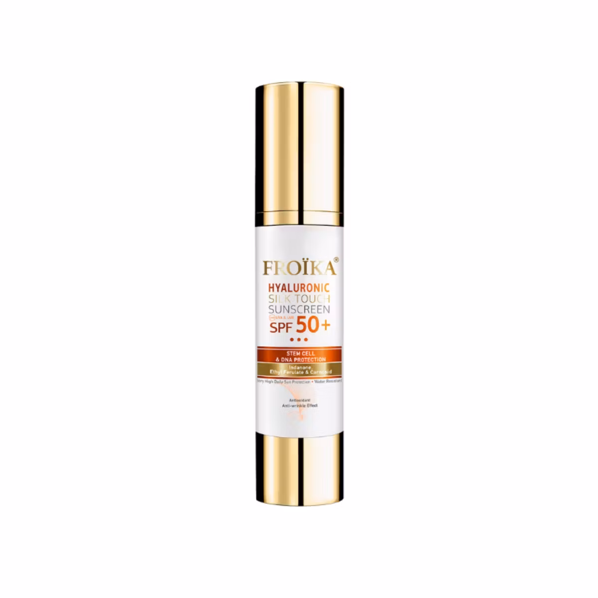 Froika Hyaluronic Silktouch Sunscreen 50+ është një krem i ri unik kundër diellit i cili, i bazuar në teknologjinë inovative të elastomerit të gjeneratës së tretë e cila siguron mbrojtje maksimale ndaj rrezatimit UVA/UVB. Veprimi i Indanonit dhe i molekulave të mbetura antioksiduese fuqizon veprimin mbrojtës. Acidi Hialorunik hidraton në thellësi lëkurën dhe ndihmon gjithashtu edhe në minimizimin e rrudhave të para.