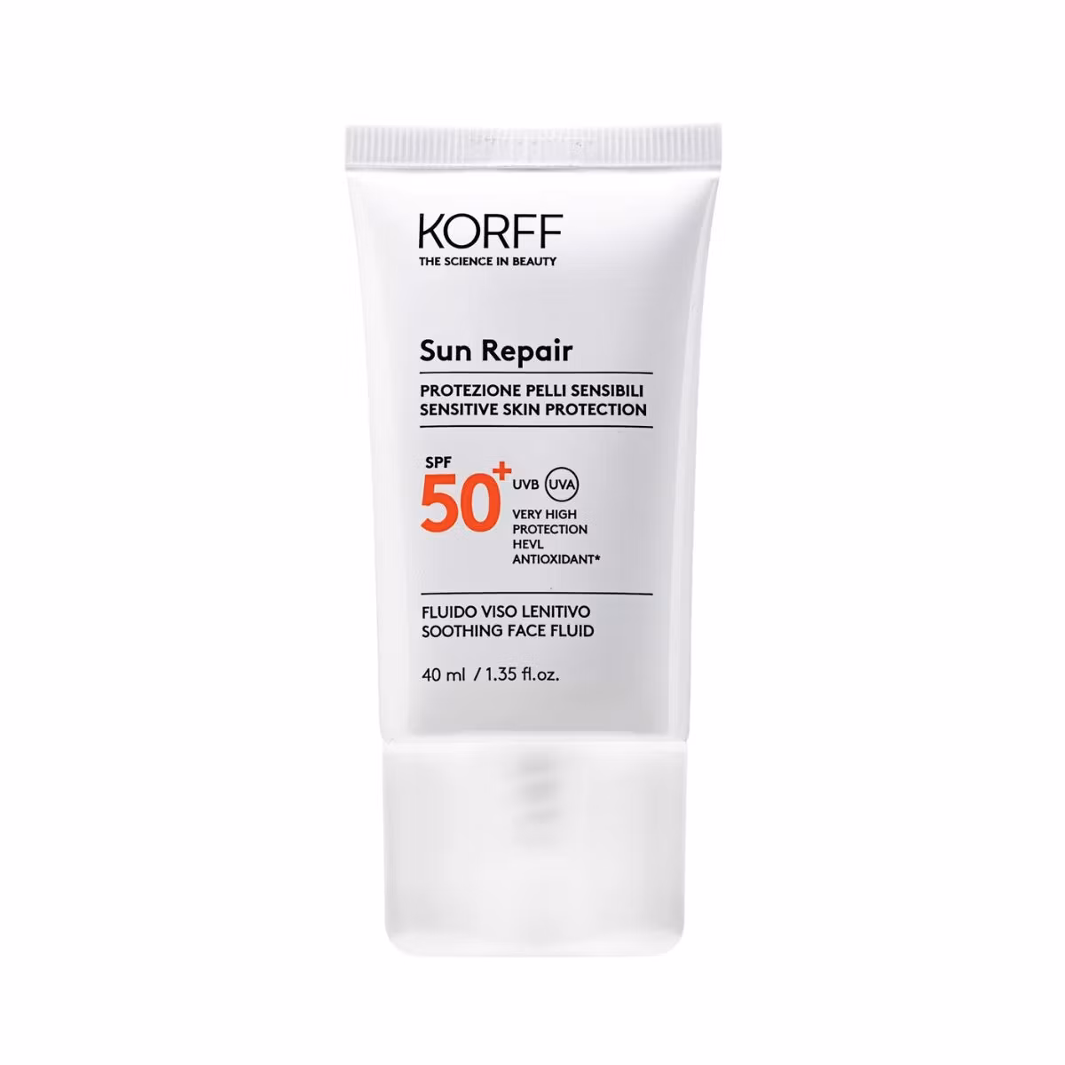 Korff Sun Repair Face fluid me faktor mbrojtës SPF 50+ mbron lëkurën nga rrezet UVA dhe UVB. Ka një teksturë të lehtë, përththet shpejt dhe në mënyrë të njëtrajtshme nga lëkura. Fluidi ka njëkohësisht edhe efekt të lartë hidratues. I përshtatshëm për lëkura sensitive. I testuar dermatologjikisht dhe klinikisht.