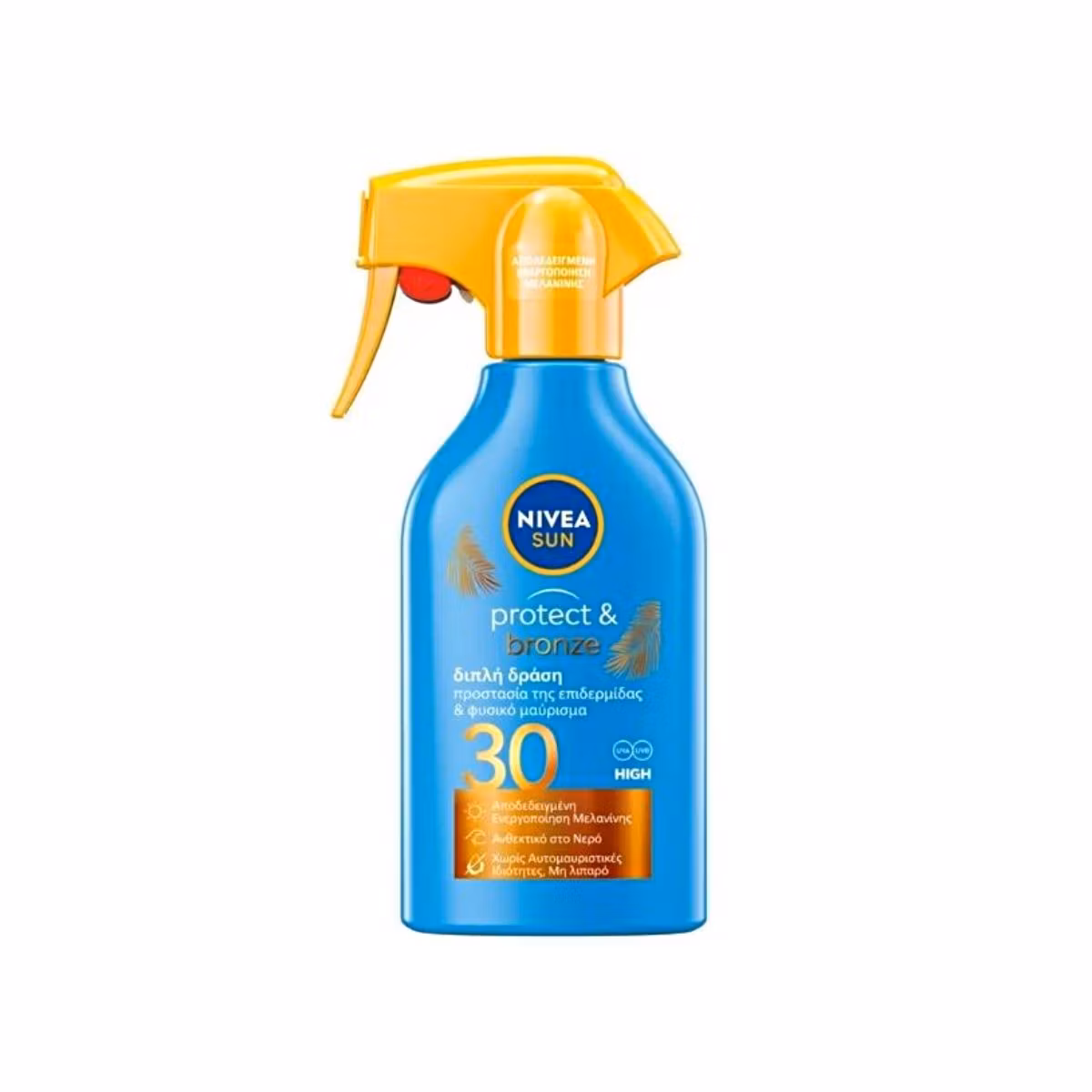 Nivea Sun Protect & Bronze Trigger Spray Spf 30 ofron mbrojtje shumë efektive dhe të menjëhershme ndaj rrezatimit UVA/UVB. Formula e pasur me ekstrakt natyral Pro-melanin mbështet procesin e nxirjes natyrale dhe të njëtrajtshme të lëkurës. Ka një teksturë të lehtë jo e yndyrshme dhe pëërthithet shpejt nga lëkura. Është rezistente ndaj ujit.