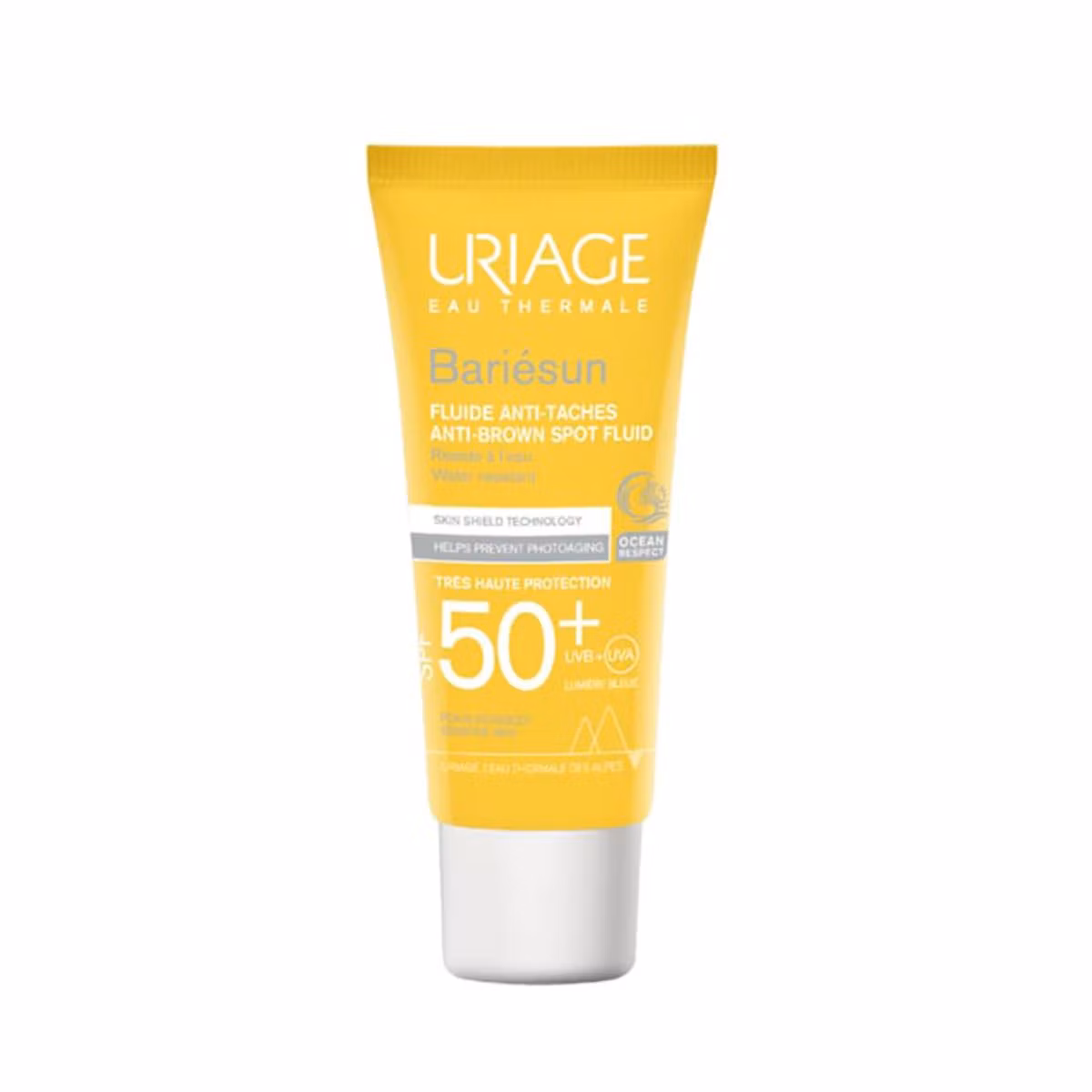 Uriage Bariesun Spf 50 + Fluide Anti- Taches është një krem mbrojtës në trajtë fluidi i cili mbron lëkurën nga rrezatimi UVA dhe UVB. Ofron një mbrojtje të lartë dhe parandalon formimin e njollave kafe në lëkurë. Tekstura e saj e lehtë përthithet shpejt dhe në mënyrë të njëtrajtshme nga lëkura dhe i jep një efekt mat.