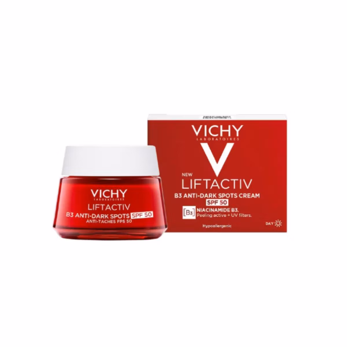 Vichy Liftactiv B3 Anti-Dark Spots Cream SPF 50 kombinon mbrojtjen nga dielli dhe veprimin kundër hiperpigmentimit.