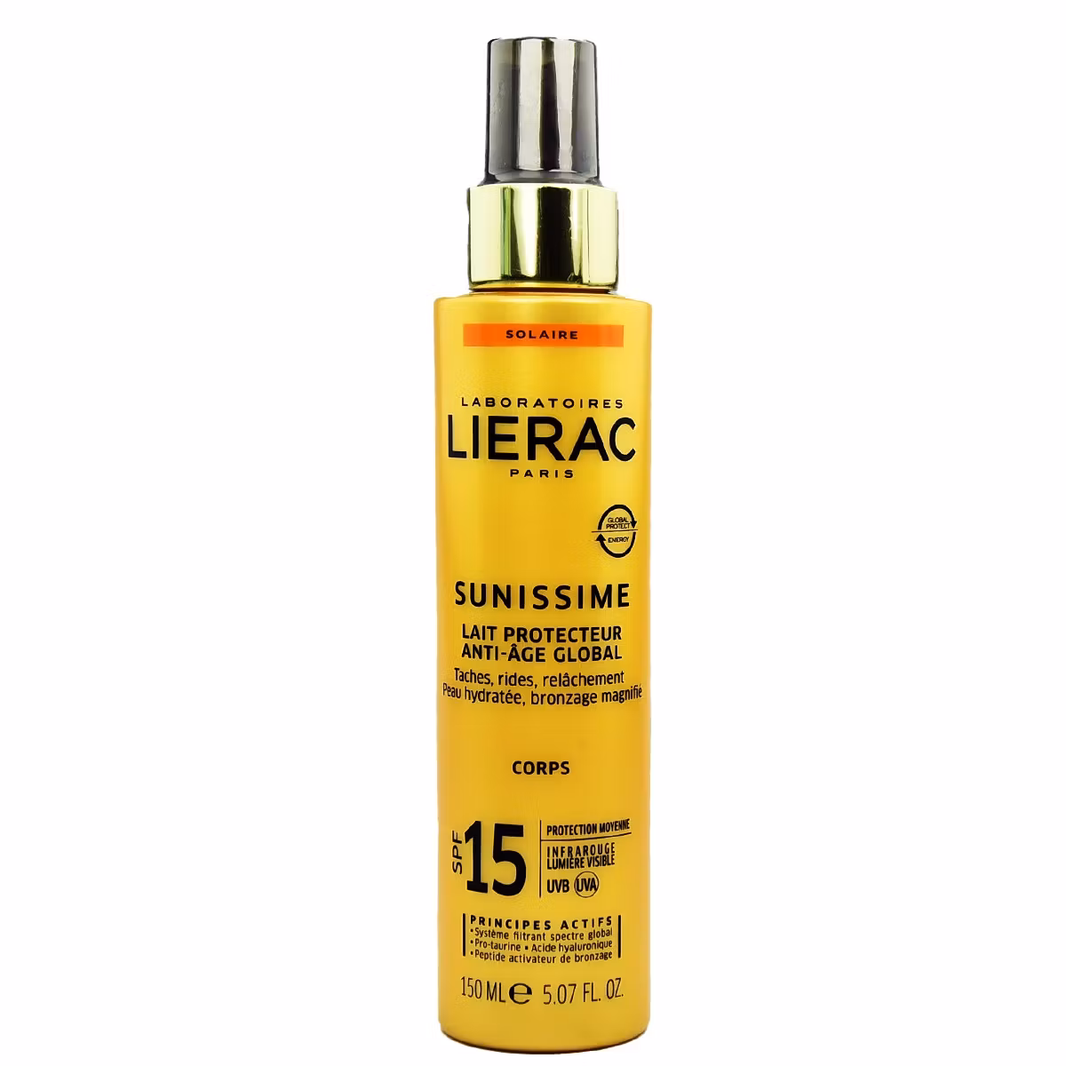 Qumësht mbrojtës Lierac Sunissime 15, është një emulsion me faktor mbrojtës 15 nga dielli që përmban filtra kundër gjithë spektrit të rrezatimit, Pro-Taurinë dhe Acid Hialuronik. Ofron një mbrojtje mesatare nga ekspozimi në diell, parandalon plakjen nga dielli dhe formimin e njollave të errëta dhe rrudhave. Pro-Taurina përshpejton riparimin e lëkurës dhe e tonifikon atë. Acidi Hialuronik formon një shtresë mbrojtëse në lëkurë dhe ka efekte hidratuese. Emulsioni është i përshtatshëm për trupin dhe përshpejton nxirjen e lëkurës.