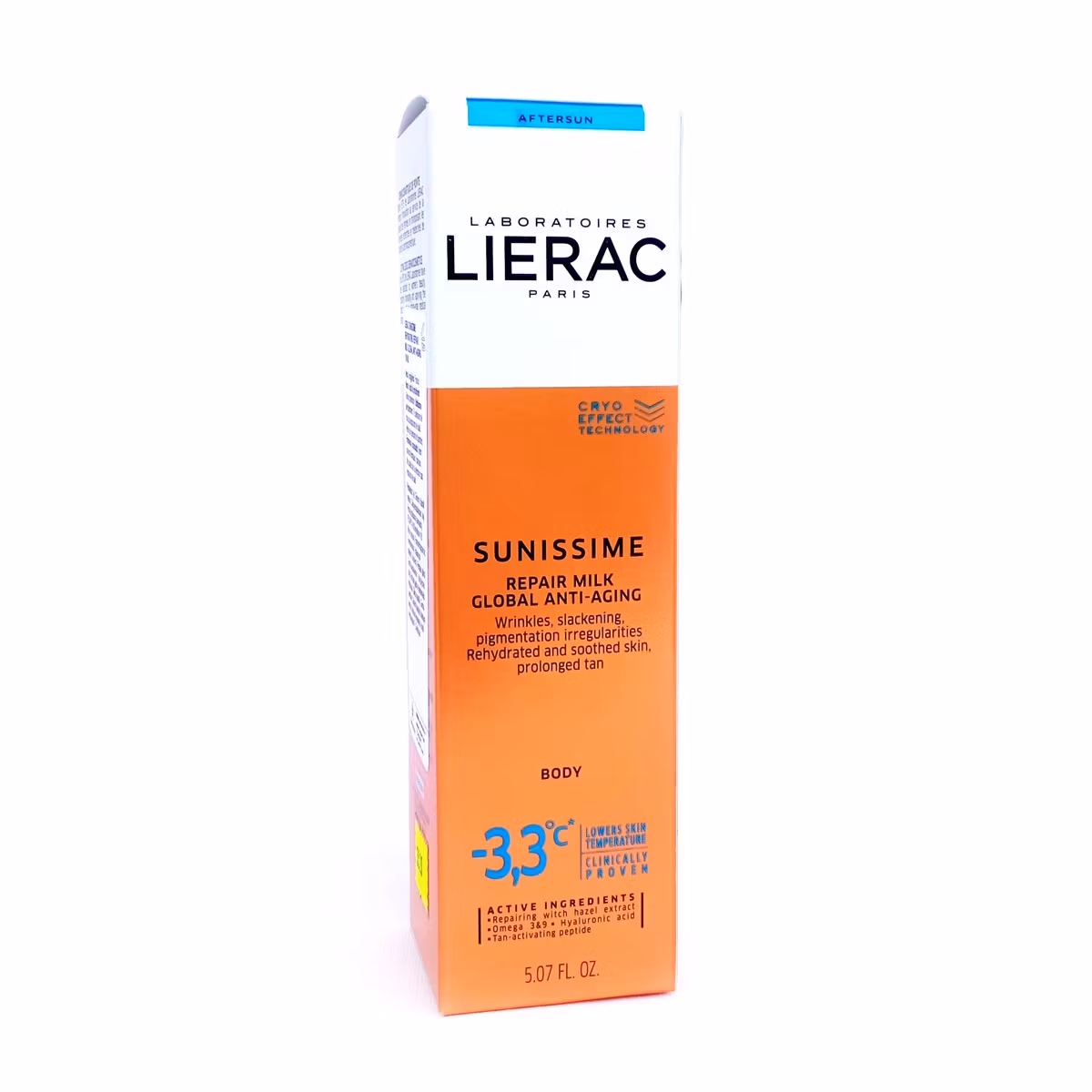 Lierac Sunissime Lait Reparateur Anti-Age Global është një locion trupi me veti anti-rrudhë I përshtatshëm për tu përdorur pas ekspozimit në diell. Hidraton, zbut dhe qetëson lëkurën. Formula e saj e pasur me Tanine nxit rigjenerimin e lëkurës së skuqur apo të djegur nga dielli. Falë teknologjisë së Crio Effect, locioni qetëson ndjesinë e djegies në lëkurë duke ulur ndjeshëm temperaturën e fytyrës deri në -3.3ﹾC.