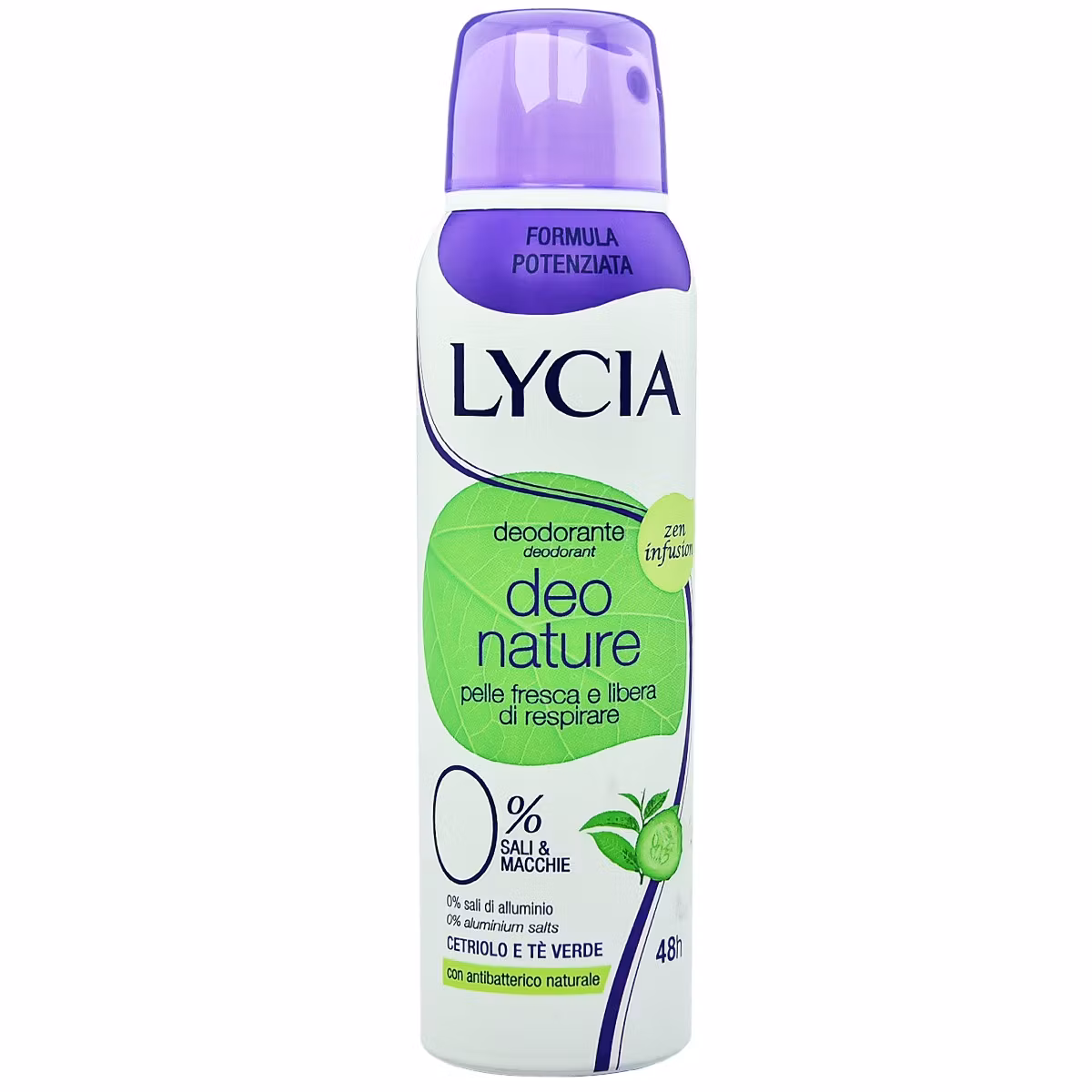Lycia Deo Nature Zen Infusion është një deodorant në një formë spraji që përmban 0% kripëra alumini. Deodoranti ka aromë kastraveci dhe çaji jeshil. Formula e saj respekton pH normal të djersitjes dhe nuk lë shenja ose njolla të verdha në rroba me ngjyra të lehta. Gjithashtu kompleksi i tij natyral antibakterial garanton mbrojtje për 48 orë.