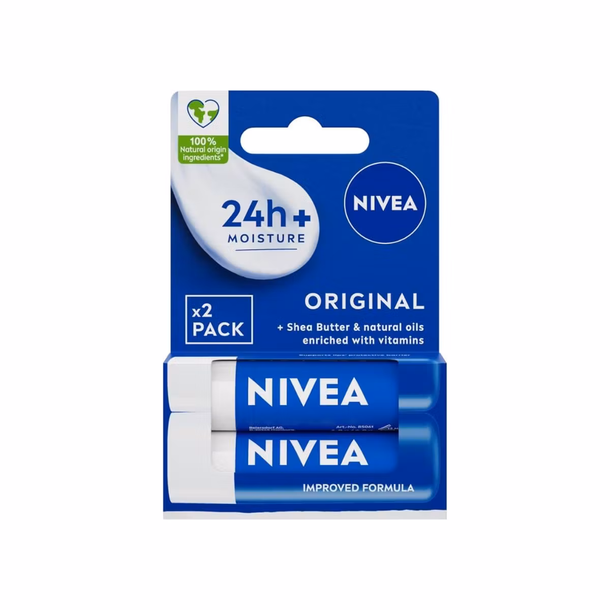 Paketimi dysh i labelos për buzët Nivea është paketim me leverdi pasi përmban dy labelo të versionit origjinal pa ngjyrë i cili mirëmban shëndetin e buzëve, optimizon nivelet e hidratimit dhe siguron mbrojtje efikase ndaj faktorëve të jashtëm si i ftohti, era dhe rrezatimi UV.