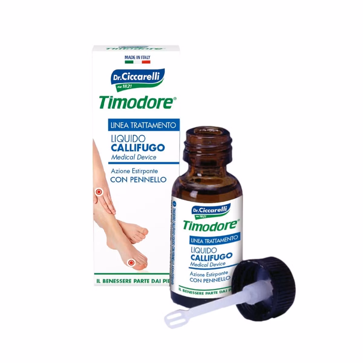 Callus Liquid Brush of the Doctor Ciccarelli Line "Foot Hygiene" përmban Kolodium dhe Acid Salicilik dhe eliminon nga këmbët çdo lloj kalloje. Largon në pak ditë çdo lloj kalloje edhe ato më të vështira dhe rezistente, pa shkaktuar dhimbje apo irritime. Produkti është i përshtatshëm për parandalimin dhe trajtimin e problemeve më të shpeshta të këmbëve dhe shputave. Produkt i përshtatshëm për të rriturit.