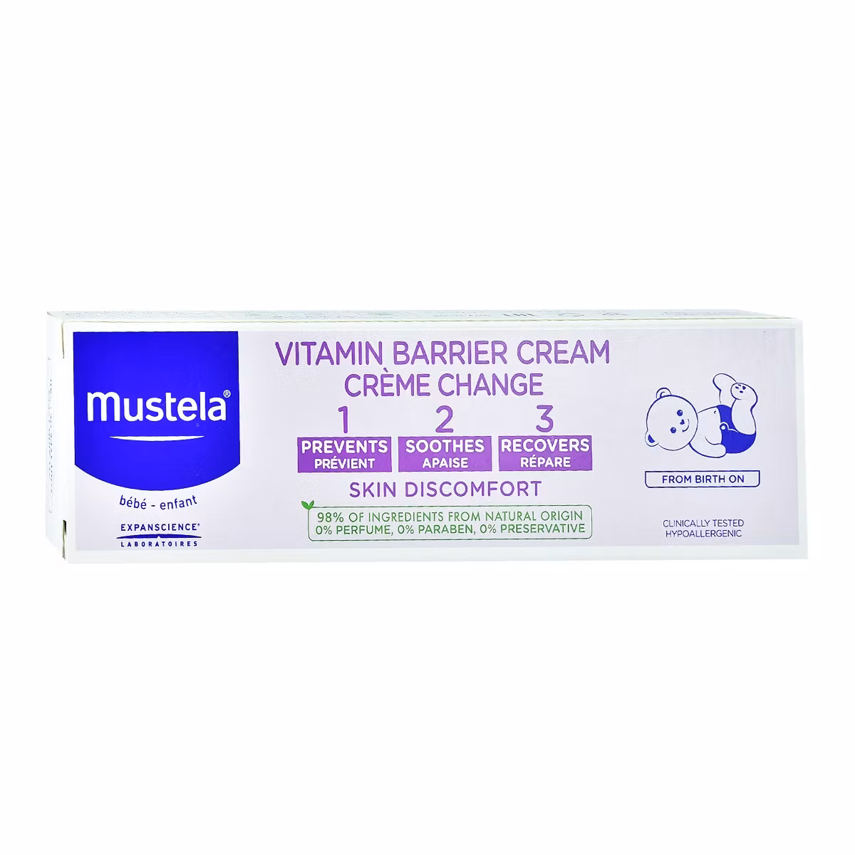 1 2 3 krem ndërrimi vitaminoz është një krem me oksid zinku dhe 98% përbërës të tjerë natyralë si vaji i lulediellit dhe avokado i përdorur për të parandaluar skuqjet, qetësuar dhe rigjeneruar lëkurën e bebeve gjatë ndërrimit të pelenave. Nuk përmban aroma, paraben apo lëndë konservuese.