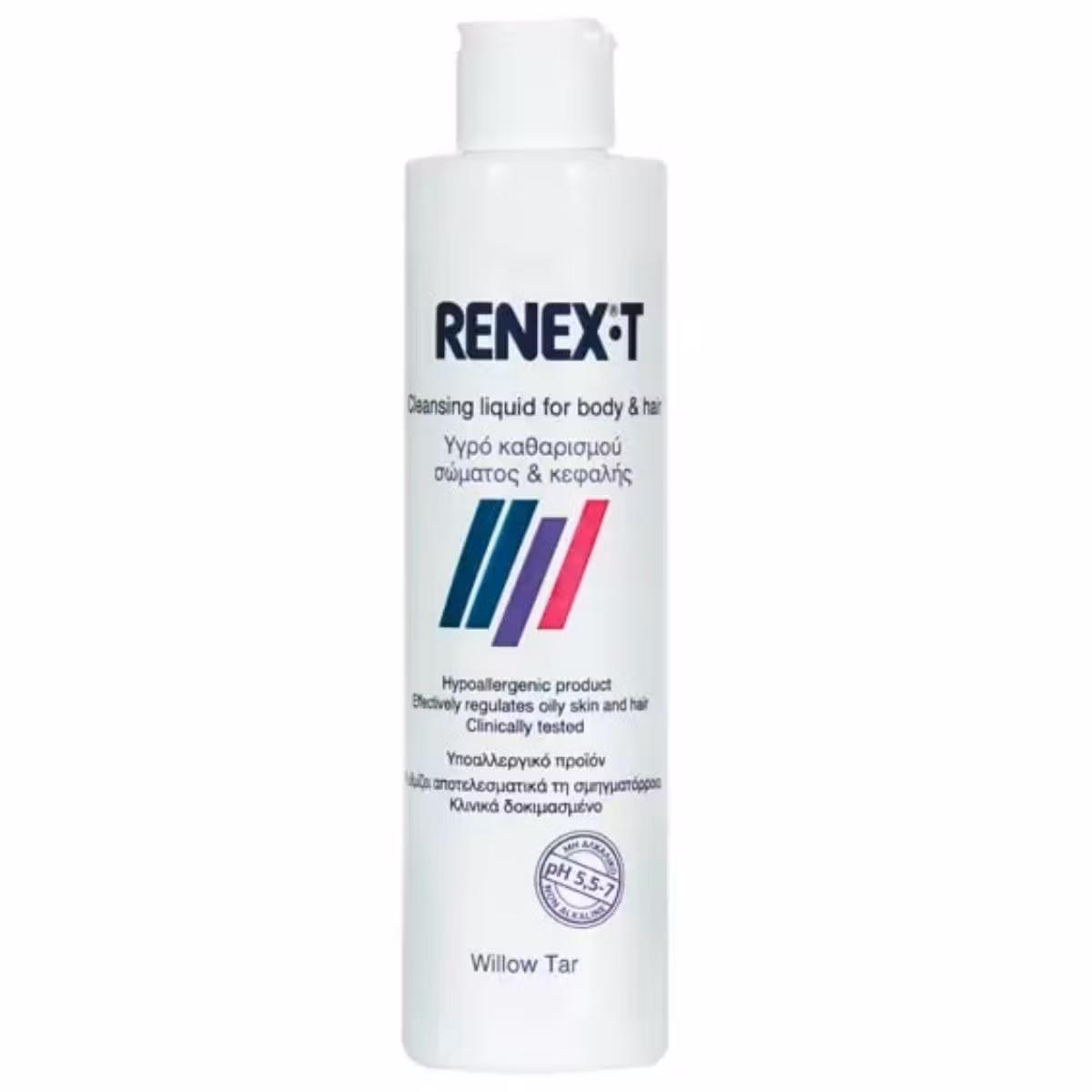 RENEX-T është një produkt për pastrimin e trupit dhe kokës shumë efektiv në rregullimin e yndyrës së lëkurës. Rekomandohet për lëkurë të yndyrshme, eksfolim, pruritus. Shumë efektiv në rregullimin e sebumit dhe eleminon zbokthin. Qetëson lëkurën e irrituar dhe ndihmon në reduktimin e kruajtjes. I pasur me Katranin dhe squfurin e Shelgut, ofron lehtësim dhe përtëritje të lëkurës. Krijon një shkumë të pasur dhe të butë, duke e lënë lëkurën të pastër dhe të shëndetshme.