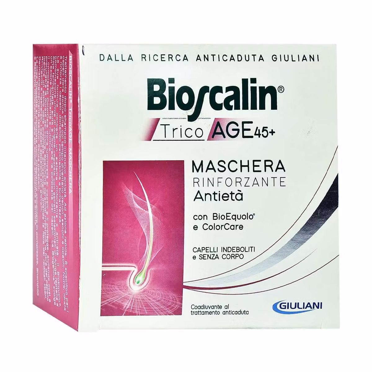 Maska Bioscalin TricoAge 45+ është formuluar për t'i dhënë fortësi, dendësi dhe shkëlqim flokëve të brishtë dhe të holluar me kalimin e moshës, ka përbërës që veprojnë në mënyrë efektive për të forcuar flokët nga rrënja. Ekstraktet e Ajuga dhe Soja e fermentuar ndihmojnë për të luftuar rënien dhe rrallimin e flokëve. Biotinë dhe Pantotenati i kalciumit kanë veprim forcues dhe ushqyes mbi flokët. Maska Tricoage mbron flokët, u jep shkëlqim dhe zgjat kohëzgjatjen e ngjyrës; kjo falë ceramideve specifike që mbulojnë fibrat e flokëve dhe falë vetive të saj antioksiduese, që e mbron atë nga radikalet e lira.