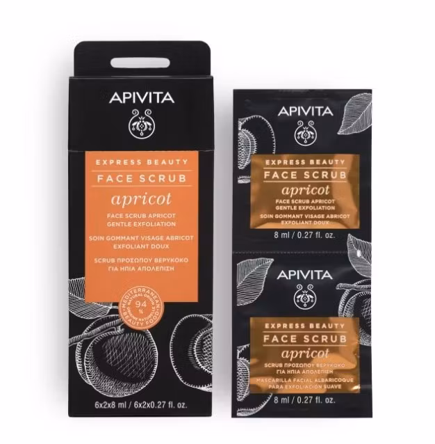 Apivita Express Beauty është një scrub fytyre që realizon eksfolimin të lehtë të lëkurës. Përmban fara të kajsisë që ndihmojë në pastrimin e lëkurës pa shkaktuar dehidratim. Vaji kajsisë, mjalti dhe kastraveci përmirësojnë strukturën e lëkurës dhe rinovojnë atë. Heq qelizat e vdekura të lëkurës. Përmban ekstrakte të trëndafilit të egër që vepron si antioksidant.