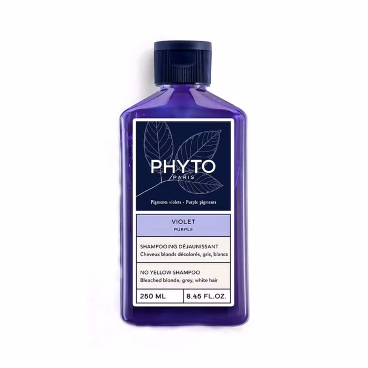 Shampo Phyto Violet No Yellow pastron butësisht flokët dhe neutralizon reflekset e padëshiruara që në aplikimin e parë. Pigmentet vjollcë të pranishme në formulim korrigjojnë reflekset e verdha për të ruajtur ngjyrën e flokëve si në momentin e lyerjes. Ekstrakti i mëllagës së bardhë i jep shkëlqim dhe butësi flokëve dhe i lë ato si mëndafshi. Pa silikone, pa surfaktantë të sulfatuar, pa ngjyra, pa PEG.