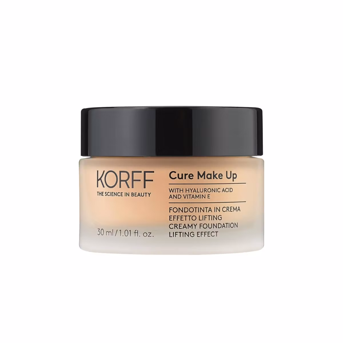 Korff Cure Make Up Creamy Lifting Effect 04 – 30 ml. Korff Cure Make Up është një fondatintë kremoze me efekt lifting që përmban Acid Hyaluronik dhe Vitaminë E. Përbërësit e tij sigurojnë një efekt të menjëhershëm lifting dhe reduktojnë rrudhat e para. Rrudhat bëhen më pak të dukshme dhe fytyra duket e butë dhe më e lëmuar. Fondatinta jep një mbulim perfekt për të gjithë ditën. Testuar nga dermatologu. Jo komedogjene.