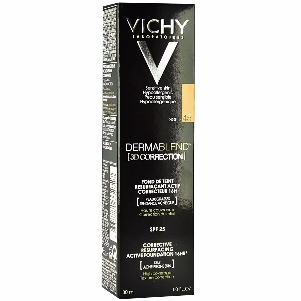 Fondatina korrigjuese Vichy Dermablend 3D është fondatinë me mbulim të lartë me ngjyrë të koncetruar të ndryshme që është e përshtatshme për lëkurat e yndyrshme, me tedencë akneike madje duke përfshirë dhe ato të ndjeshme. Ka mbulim që zgjat për një kohë të gjatë deri në 16 orë dhe hidraton lëkurën për 24 orë pa e tharë atë. Mbulon problemet e lëkurës duke përfshirë aknet, shenjat, rrathët e zinj, rozacea, vitiligo, tatuazhet dhe gërvishtjet. Fondatina Vichy i jep lëkurës një pamje natyrale dhe tekstura e tij e lëngshme siguron që nuk ka mbetje pigmentesh në lëkurë.