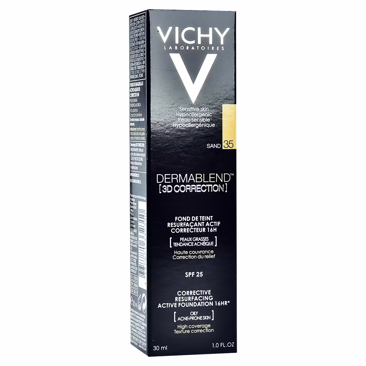 Fondatina korrigjuese Vichy Dermablend 3D është fondatinë me mbulim të lartë me ngjyrë të koncetruar të ndryshme që është e përshtatshme për lëkurat e yndyrshme, me tedencë akneike madje duke përfshirë dhe ato të ndjeshme. Ka mbulim që zgjat për një kohë të gjatë deri në 16 orë dhe hidraton lëkurën për 24 orë pa e tharë atë. Mbulon problemet e lëkurës duke përfshirë aknet, shenjat, rrathët e zinj, rozacea, vitiligo, tatuazhet dhe gërvishtjet. Fondatina Vichy i jep lëkurës një pamje natyrale dhe tekstura e tij e lëngshme siguron që nuk ka mbetje pigmentesh në lëkurë.