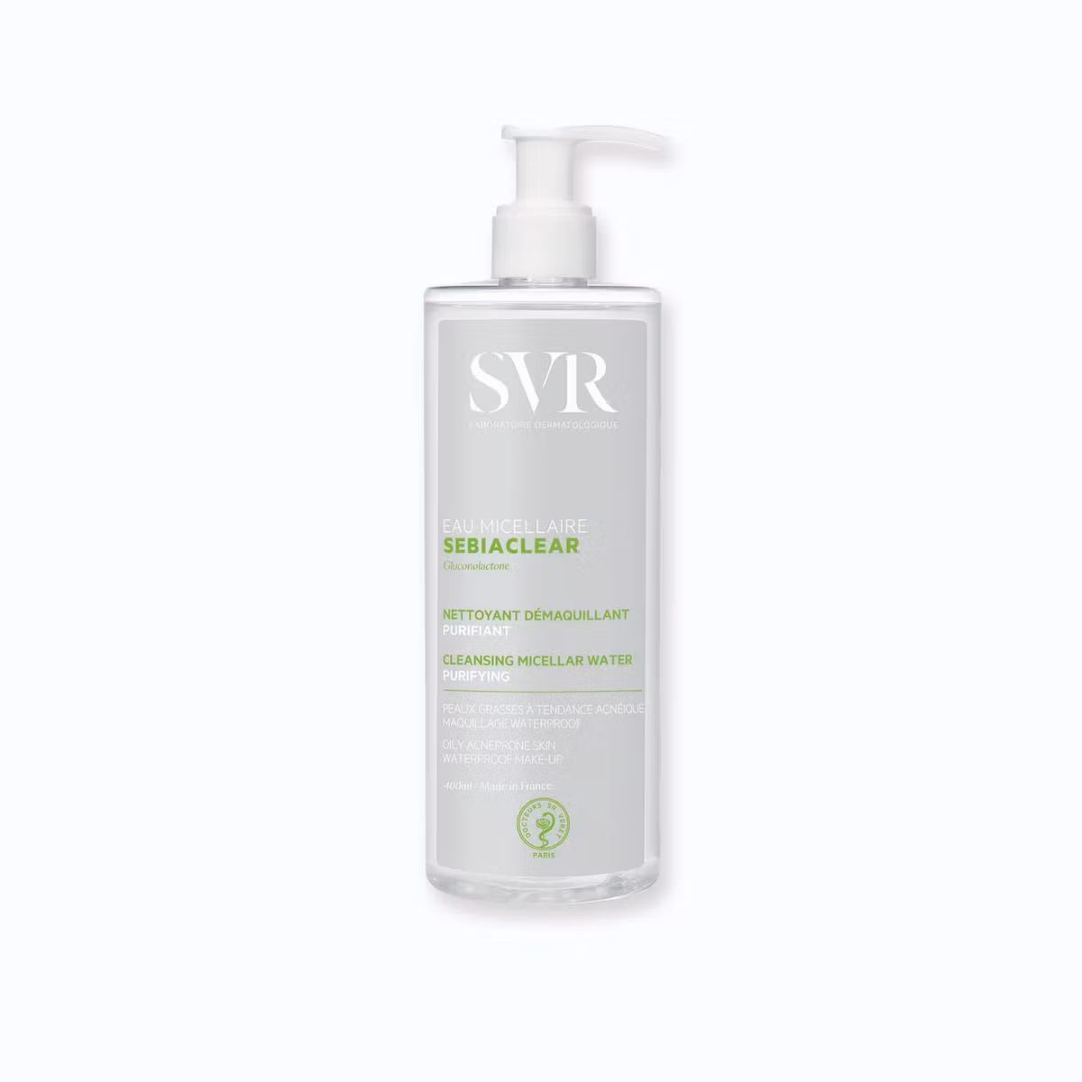 Ujë pastrues demakijues dhe në të njëjtën kohë matifikues i cili është i destinuar për lëkurën e yndyrshme me tendencë akneike. Një pastrues demakijues që pastron, purifikon dhe largon make-up-in në një hap të vetëm, madje edhe make-up-in e papërshkueshëm nga uji. Ndihmon në luftën kundër akneve, pikave të zeza dhe poreve të zgjeruara duke larguar papastërtitë dhe sebumin e tepërt pa u tharë. Lëkura është e pastër, e freskët dhe e matifikuar. Hipoalergjik, pa sapun, pa alkool, pa paraben dhe pa ngjyrues, ky ujë micellar Sebiaclear SVR përmban gjithashtu glukonolactone për të zhbllokuar poret dhe për të pastruar lëkurën.