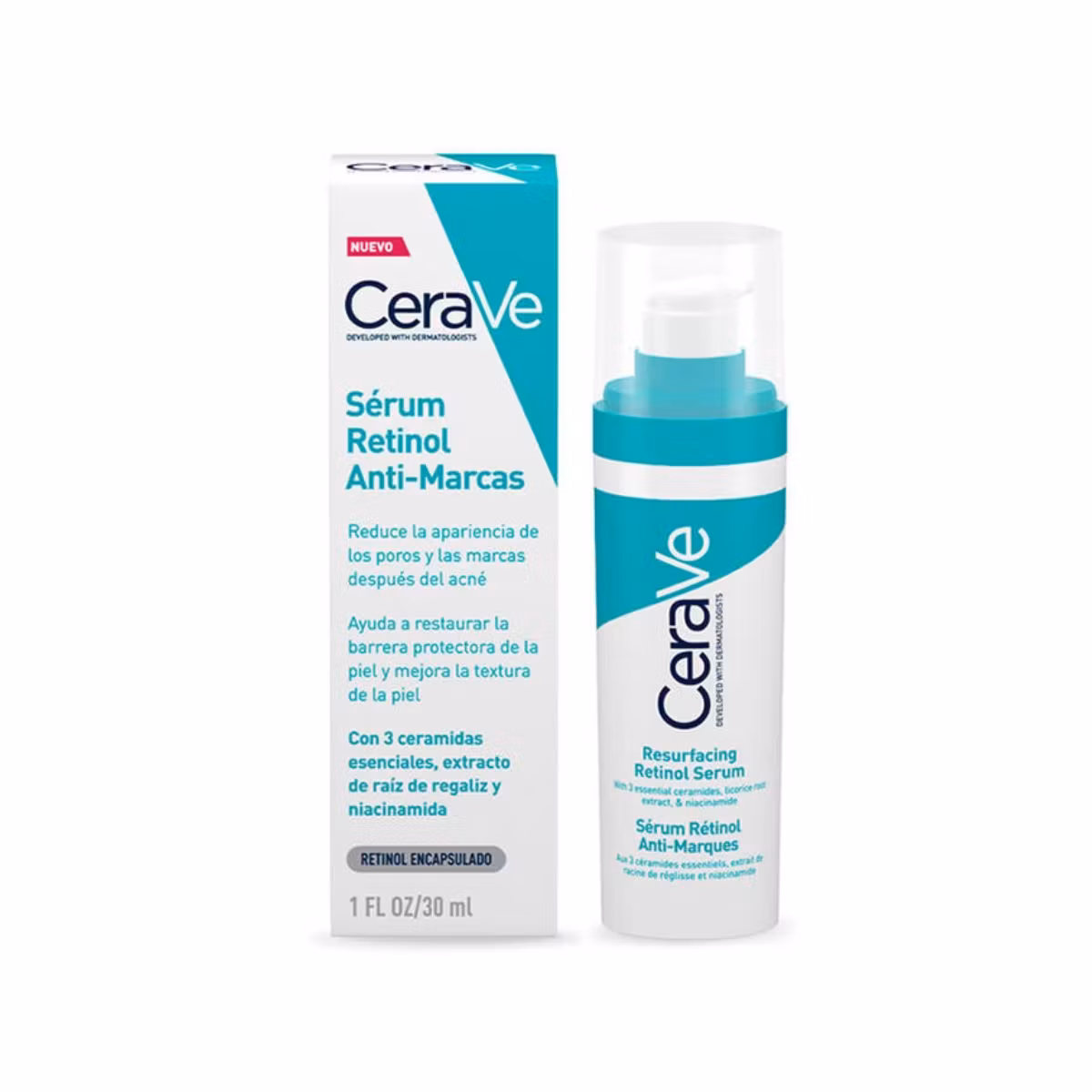 CeraVe Resurfacing Retinol Serum 30ml është një serum i formuluar posaçërisht për lëkurën e prirur ndaj njollave dhe në reduktimin e shenjave pas akneve. Formula e saj ka në përmbajtje kombinimin e retinolit dhe ceramideve. Retinoli ndihmon në reduktimin e njollave të hiperpigmentimit dhe shenjat post-akne në sajë të stimulimit të rigjenerimit qelizor. Ceramidet ushqejnë dhe hidratojnë barrierën mbrojtëse të lëkurës. Formula eshtë e pasuruar edhe me Niacinamide, përbërës i cili bën të mundur kontrollin e sebumit të tëpërt në lëkurë si dhe në minimizimin e porove duke i dhënë lëkurës një pamje të njëtrajtshme.