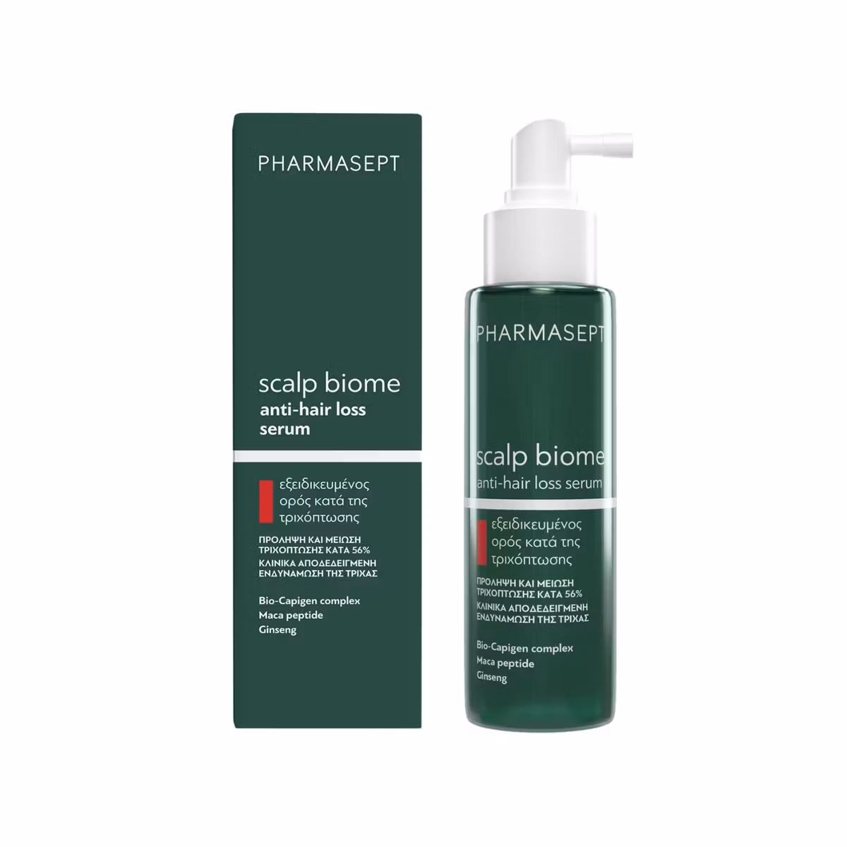Pharmasept Scalp Biome Anti-Hair Loss Serum 100 ml është një serum i avancuar për kujdesin e skalpit, i formuluar me ekstrakte bimore bioaktive dhe përbërës të gjeneratës së re që synojnë të reduktojnë rënien e flokëve dhe të përmirësojnë dendësinë e tyre. Veprimi i tij ndihmon në rregullimin e ciklit natyral të rritjes së flokëve duke zgjatur fazën aktive (anagjene) dhe duke rritur vitalitetin e folikulave, çka rezulton në flokë më të fortë, më rezistentë dhe më të plotë. Formula përmban kompleksin botanik Bio-Capigen me vitamina, aminoacide, biotinë dhe ekstrakte si xhensen dhe qepë e kuqe, të cilat stimulojnë metabolizmin qelizor dhe ushqejnë rrënjën e flokut, ndërsa peptidet si Maca ndihmojnë në mbrojtjen nga stresi oksidativ dhe në stabilizimin e ciklit të rritjes. I përshtatshëm për përdorim të përditshëm dhe për të gjitha tipet e skalpit, ky serum kontribuon në një skalp të balancuar dhe në flokë dukshëm më të dendur dhe më të shëndetshëm me përdorim të rregullt.