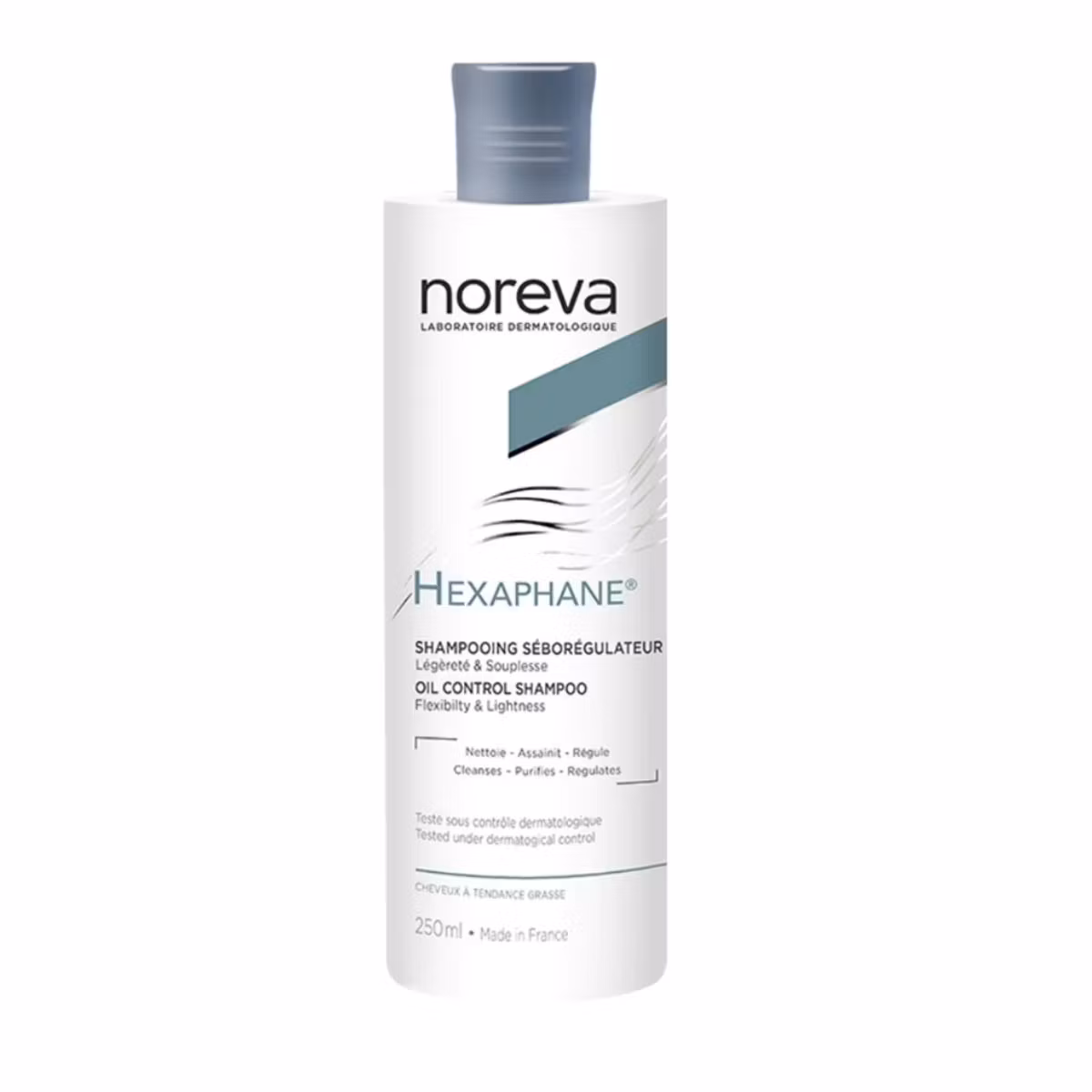Shampo Noreva Hexaphane Oil Control pastron dhe hidraton lëkurën e kokës falë përbërësve aktivë dhe surfaktantëve specifikë. Derivatet e Acidit Abietik dhe proteinat e Sojës rregullojnë prodhimin e yndyrës dhe ndihmojnë në rritjen e flokëve. Pidolatet e Bakrit dhe Zinkut kanë efekt të fuqishëm antiseptik. Eleminon ndjesinë e kruajtjes që vjen si shkak e yndyrës së tepërt në kokë.