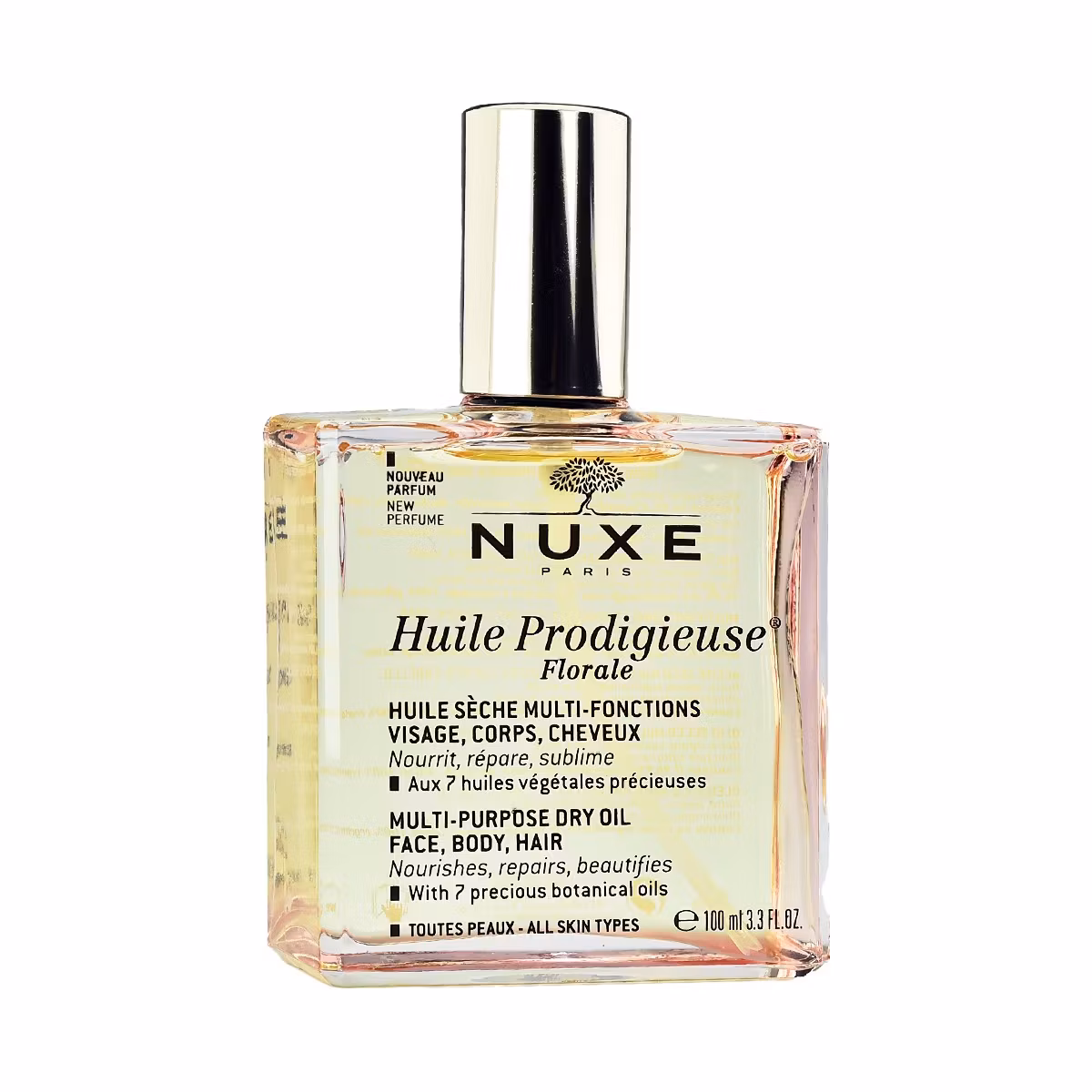 Nuxe Hulie Prodigiues Florale është një vaj shumë-funksional për fytyrën, trupin dhe flokët. Përmban 96.6% përbërës me origjinë natyrale. Përmban 7 vajra të çmuar bimore, si vaji ripararues i Arganit dhe vaji hidratues i Tsubaki. Si një produkt shumë-funksional, ai ushqen, zbut lëkurën, i le flokët të butë dhe me shkëlqim. Ka veti antioksiduese dhe ka aftësi të reduktojë dukjen e strijave.