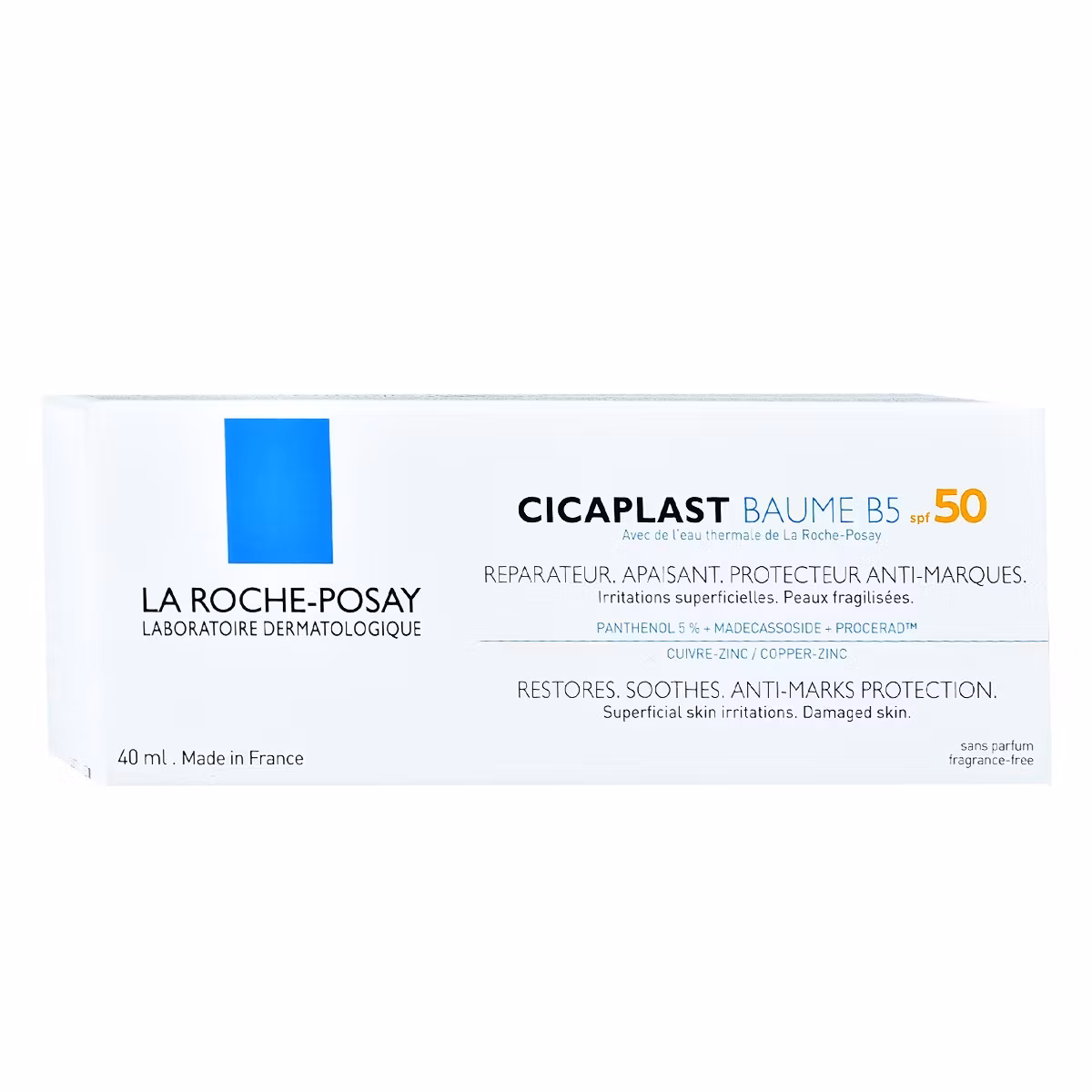 La Roche Posay Cicaplast Baume B5 me faktor mbrojtës SPF 50+, është një krem qetësues për lëkurë të ekspozuar në rrezet e përditshme UV, për irritimet sipërfaqësore të lëkurës (përfshirë edhe pas bërjes së peeling). Mund të përdoret nga fëmijët mbi 3 vjeç. Kremi siguron rigjenerim të lëkurës, efekt qetësues, efekt kundër kruarjes, parandalim e shenjave të kuqe ose kafe dhe mbrojtjen e tatuazheve.