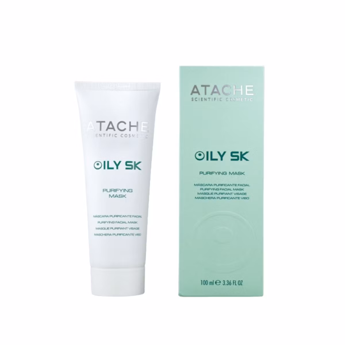 Atache Oil Skin Purifying Mask është një maskë pastruese për fytyrën, ideale për përdorim në lëkurë të yndyrshme, mikse dhe/ose të prirur ndaj akneve. Pastron në thellësi lëkurën duke i dhënë asaj një ndjesi lehtësimi dhe freskie, duke eliminuar shkëlqimin që vjen nga yndyra e tepërt. Formula me përbërës aktivë, si Kaolina, Oksid Zinku, Biosulfur të lëngshëm, Allantoin dhe Bisabolol, kontrollojnë prodhimin e sebumit dhe trajtojnë aknet. Kjo maskë fytyre pastron lëkurën, ndihmon në unifikimin e tonit të lëkurës dhe përmirëson teksturën e lëkurës. Përveç kësaj, ndihmon në rigjenerimin e lëkurës falë efektit të tij keratolitik, i cili vepron në shkëputjen e qelizave të vdekura nga sipërfaqja e lëkurës.
