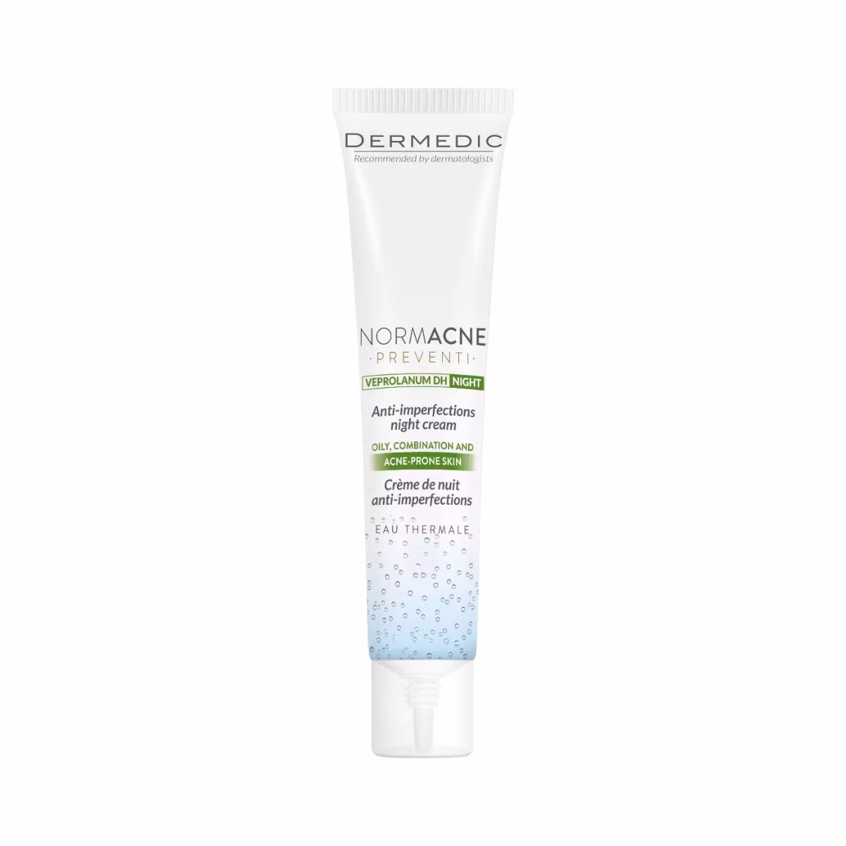 Dermedic Normacne Prevent Veprolanum DH Night Cream është kremi i natës i përshtatshëm për lëkurën mikse, të yndyrshme dhe atë me tendencë akneike. Falë përmbajtjes së saj me uji termal, kompleksin e veprolanum-it, papaina, acidin hialuronik, gjalpin e kakaos, gjalpin e sheas, vajin e ullirit, vitaminën C+E kontrollon veprimin e baktereve të dëmshme në lëkurë që shkaktojnë akne si dhe rregullon sekretimin e sebumit. Prania e vitaminës E dhe C me veprim të fuqishëm antioksidues e mbron lëkurën nga veprimi i radikaleve të lira dhe stresi oksidativ. Jo-komedogjenike. Hipoalergjenike.