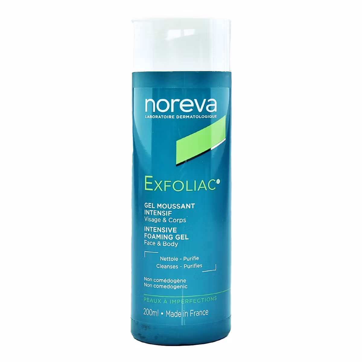 Xheli shkumë intensiv Noreva Exfoliac është një larës për fytyrën dhe trupin, me lëndë aktive që luftojnë shenjat në lëkurë. Ndihmon në eleminimin e papastërtive, rregullimin e sekretimit të yndyrës, duke mos ndryshuar pH e lëkurës. Poret zvogëlohen dhe lëkura nuk ngelet e thatë pas larjes.