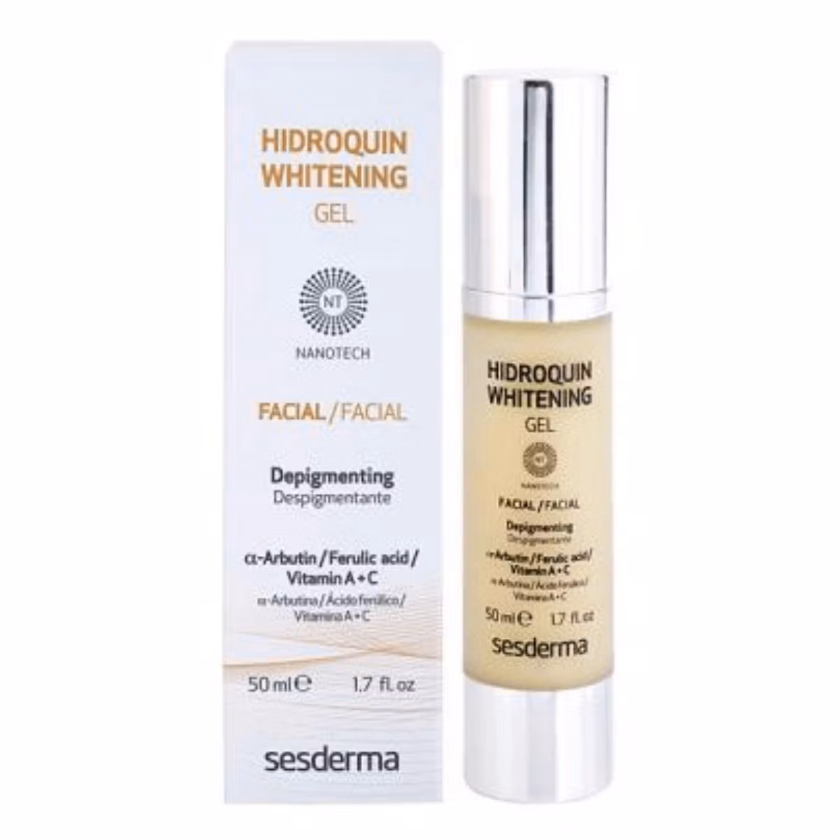 Hidroquin Whitening Gel është një xhel i cili parandalon dhe trajton njollat e lëkurës, njollat e moshës, shenjat e akneve dhe dëmtimin nga dielli duke njëtrajtësuar sipërfaqen e saj. Formula përbëhet nga kombinimi i përbërësve aktivë: agjentë depigmentues, Vitaminë C me veti antioksiduese, Niacinamide dhe Retinol. I përshtatshëm për të gjitha llojet e lëkurës.