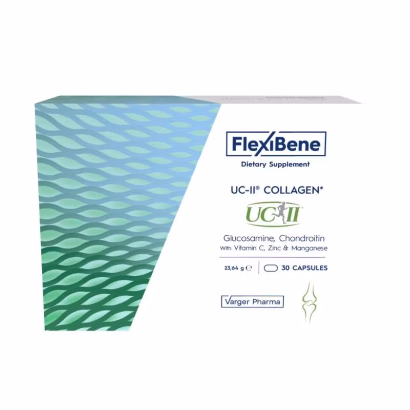 FlexiBene është një suplement me formulë të avancuar për shëndetin e artikulacioneve, që kombinon UC-II® – gjenerata e re e kujdesit për kyçet – me glukozaminë, kondroitinë, vitaminë C, zink dhe mangan. Kjo përbërje ndihmon në reduktimin e dhimbjes dhe ngurtësimit, përmirëson lëvizshmërinë dhe mbështet rigjenerimin e kartilagove. Mekanizmat e ndryshëm të veprimit të përbërësve punojnë në sinergji për një efektivitet maksimal në komfortin dhe funksionin e kyçeve.