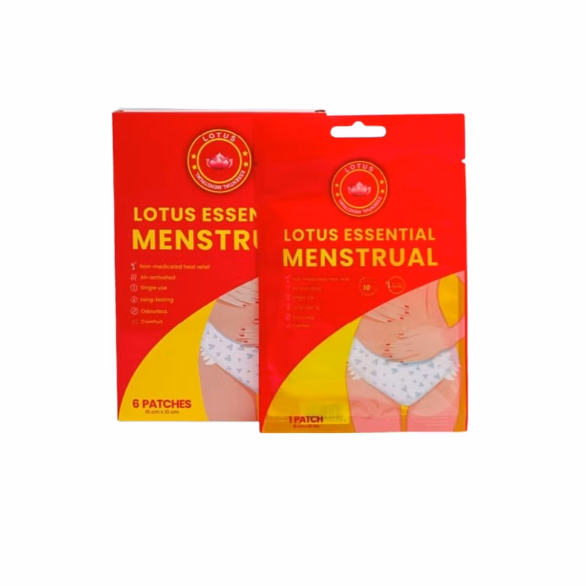 Lotus essential menstrual patch është një terapi në të nxehtë në trajtë ngjitësesh të cilat lehtësojnë dhimbjet menstruale (dismenorrenë). Ky ngjitës termoterapeutik relakson muskujt e tensionuar dhe rrit qarkullimin e gjakut në zonën e prekur, duke lejuar më shumë oksigjen dhe lëndë ushqyese të ndihmojnë në procesin e shërimit. Ky ngjitës aktivizohet përmes ajrit, prandaj duhet hapur vetëm në momentin që do përdoret. Patchi është 1-përdorimësh dhe efekti i tij zgjat deri ne 10 orë.