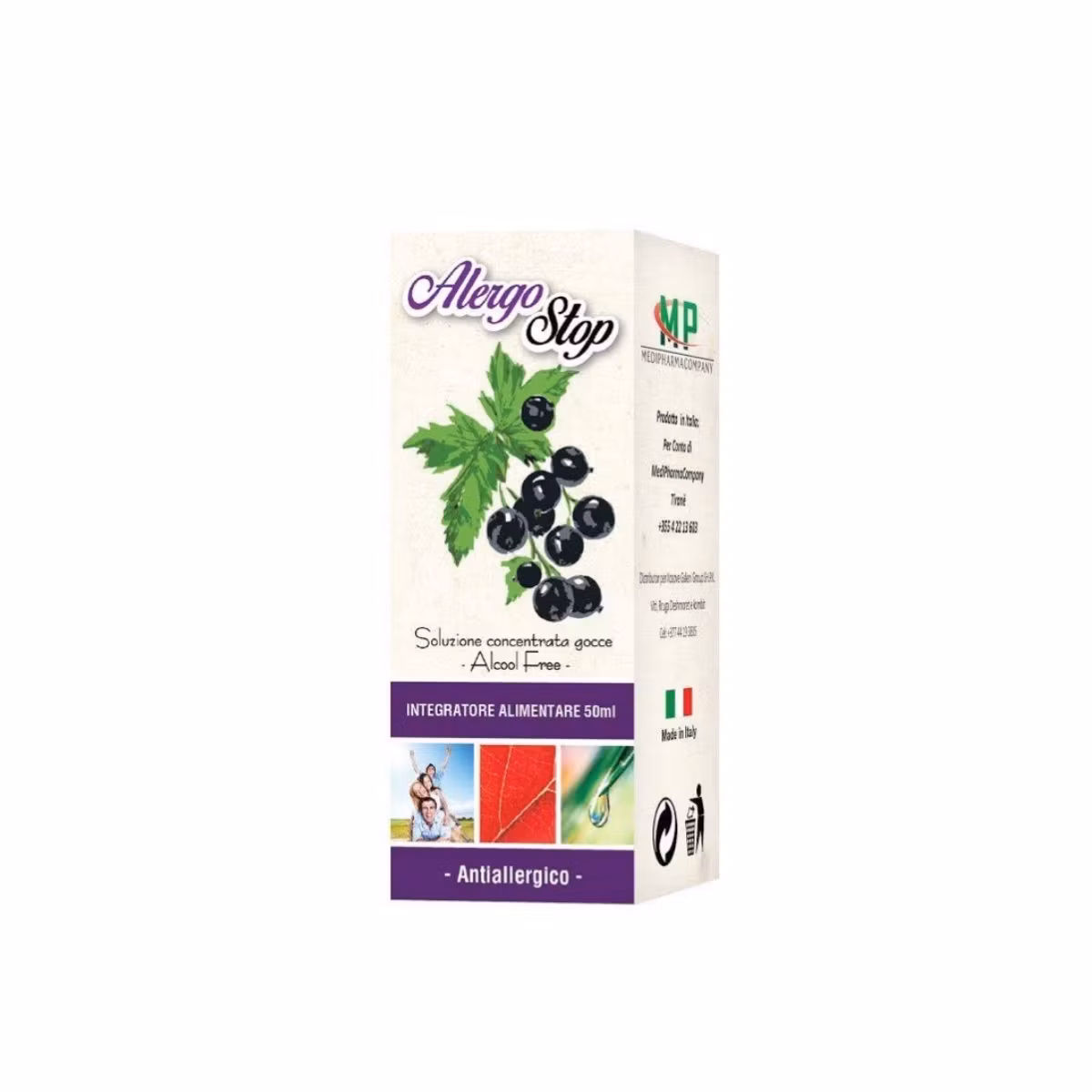 Alergo Stop është një suplement me pika i cili ka veti antihistaminike, antiinflamatore dhe stimuluese. Ai është krijuar nga Ekstraktet Hidroglicerike të gjetheve dhe ekstraktet e frutave. Gjethet e RIBES NERO (Ribizilla) janë të pasura me Vitaminë C, Flavonoide, Oligoelemente, Acid Malik, Acid Citrik me aftësi të ndihmojnë funksionin fiziologjik të rrugëve të sipërme të frymëmarrjes. Suplementi ndihmon në rastet e një astme bronkiale, sinuzit, rinit alergjik, laringit, faringit, gjendje febrile, influenze. Qetësues i rrugëve të frymëmarrjes edhe gjatë natës.