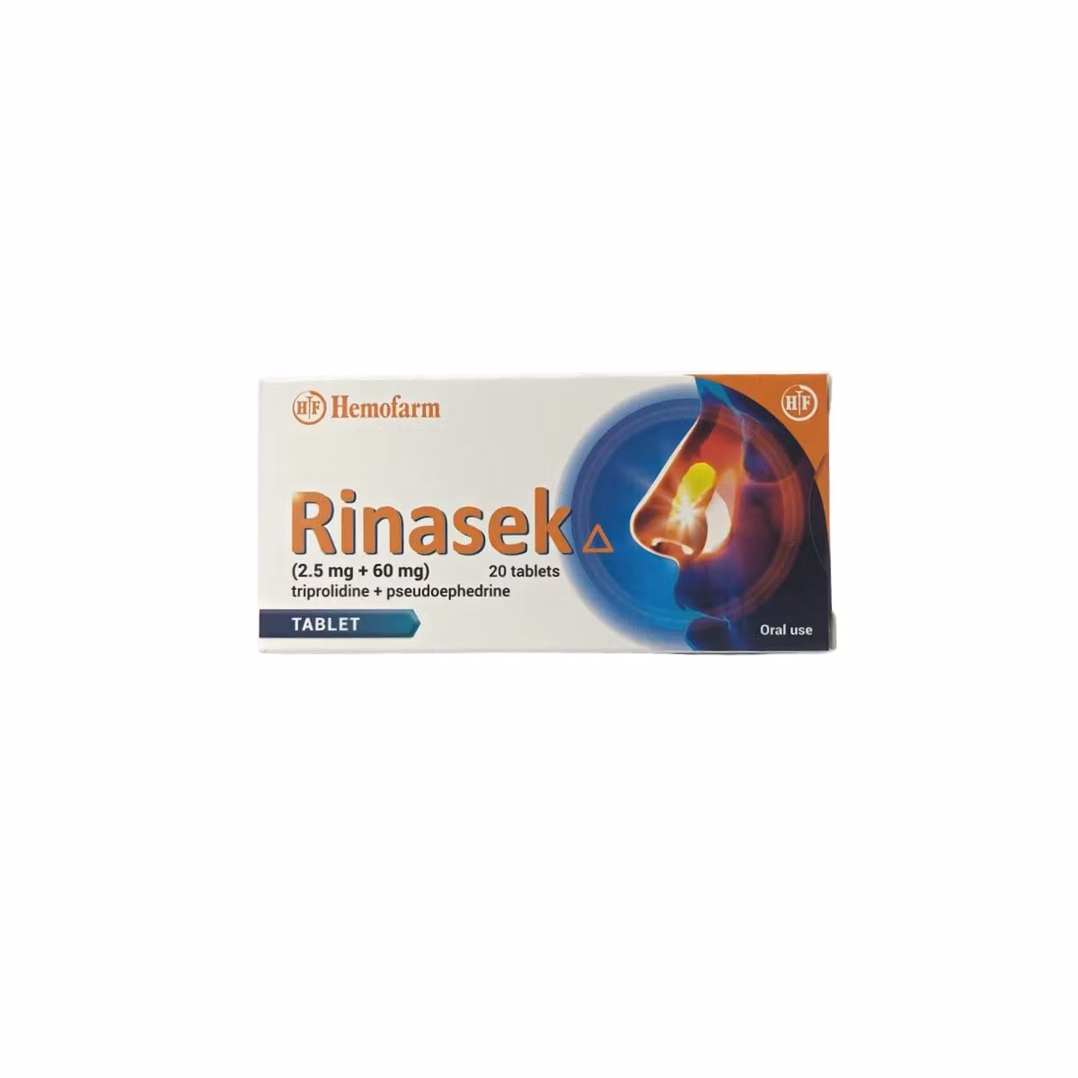 Rinasek përmban substancën aktive Triprolidin dhe Pseudoefedrinë. Triprolidina është një antihistaminik (antialergjik) i cili përdoret për të trajtuar alergjitë dhe për të reduktuar simptomat e saj (teshtima, sekretimi nga hunda, lotimi i syve). Pseudoefedrina ngushton enët e gjakut në zonën e hundës dhe në këtë mënyrë çon në ulje të ënjtjes së mukozës të hundës.