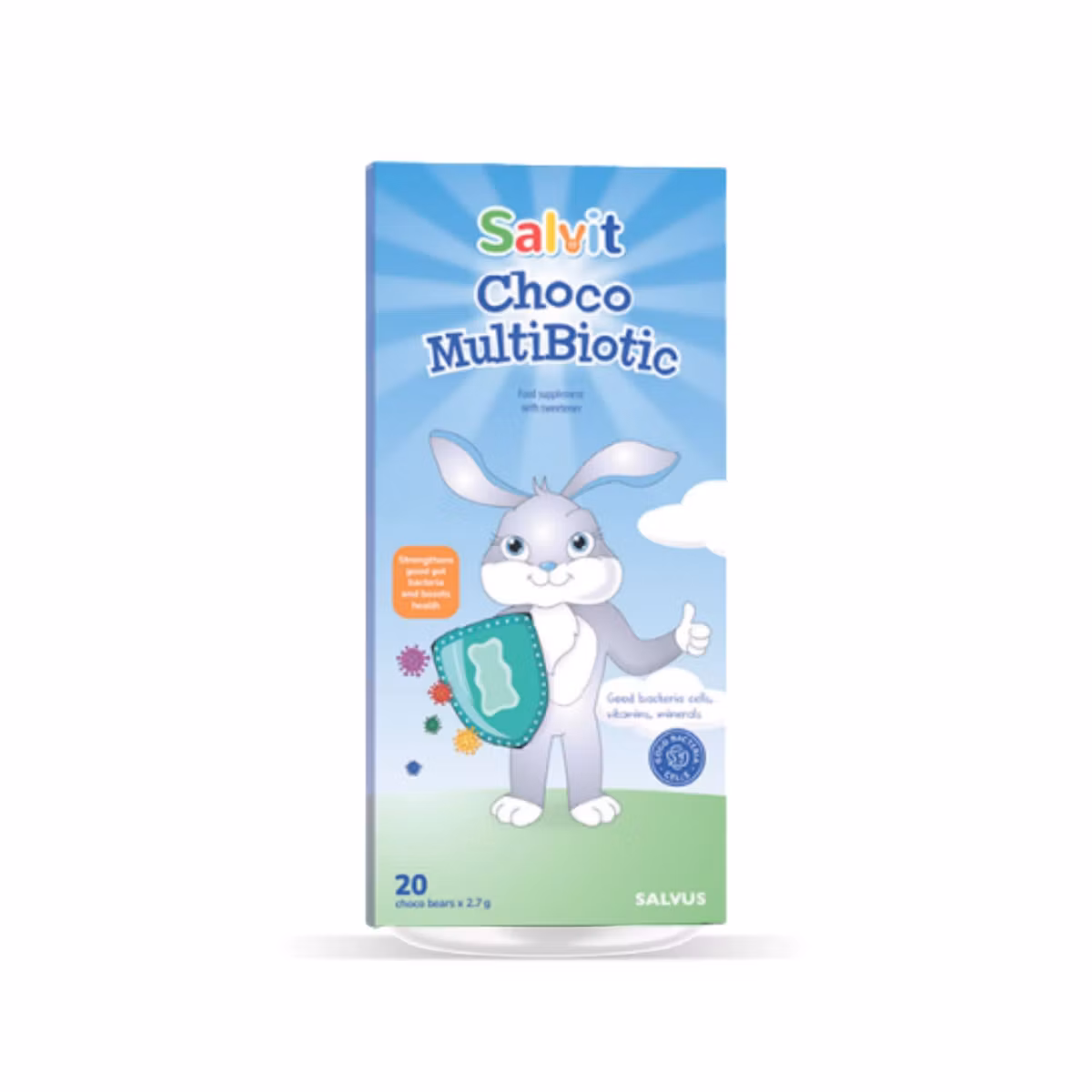 Salvit Choco Multibiotic Bears 20 është një suplement ushqimor në formë arushësh përtypës me shije çokollate, i krijuar për të mbështetur shëndetin e sistemit tretës dhe ekuilibrin e florës intestinale. Me përmbajtje probiotikësh të përzgjedhur, ky produkt ndihmon në ruajtjen e mikroflorës së dobishme të zorrëve, veçanërisht pas terapisë me antibiotikë ose gjatë periudhave me çrregullime të tretjes. Forma argëtuese dhe shija e këndshme e bëjnë ideal për fëmijë, duke e kthyer marrjen e probiotikëve në një përvojë të lehtë dhe të këndshme për përdorim të përditshëm.