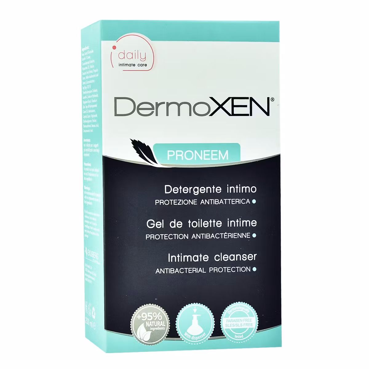 DermoXEN Proneem Intimate Cleanser është një larës intim me vaj Neem, ekstrakt Propolisi dhe Tribulus Terrestris i përshtatshëm për higjienën personale të femrave. Pastron zonën intime dhe parandalon infeksionet bakteriale dhe kërpudhore. Vaji i Neem dhe ekstrakti i Propolisit kanë efekte hidratuese, qetësojnë dhe mbrojnë mukozën e vaginës. Tribulus Terrestris vepron kundër baktereve.