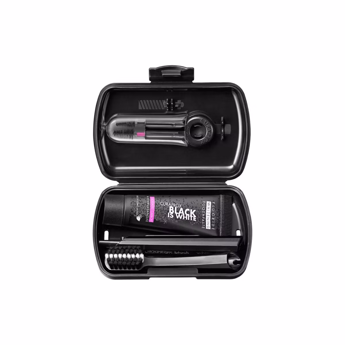 Seti Black is white Travel vjen me një furçë dhëmbësh elegante, unike dhe të sofistikuar, një pastë dhëmbësh zbardhuese, plus dy furça konike ndërdhëmbore dhe një mbajtëse duo.