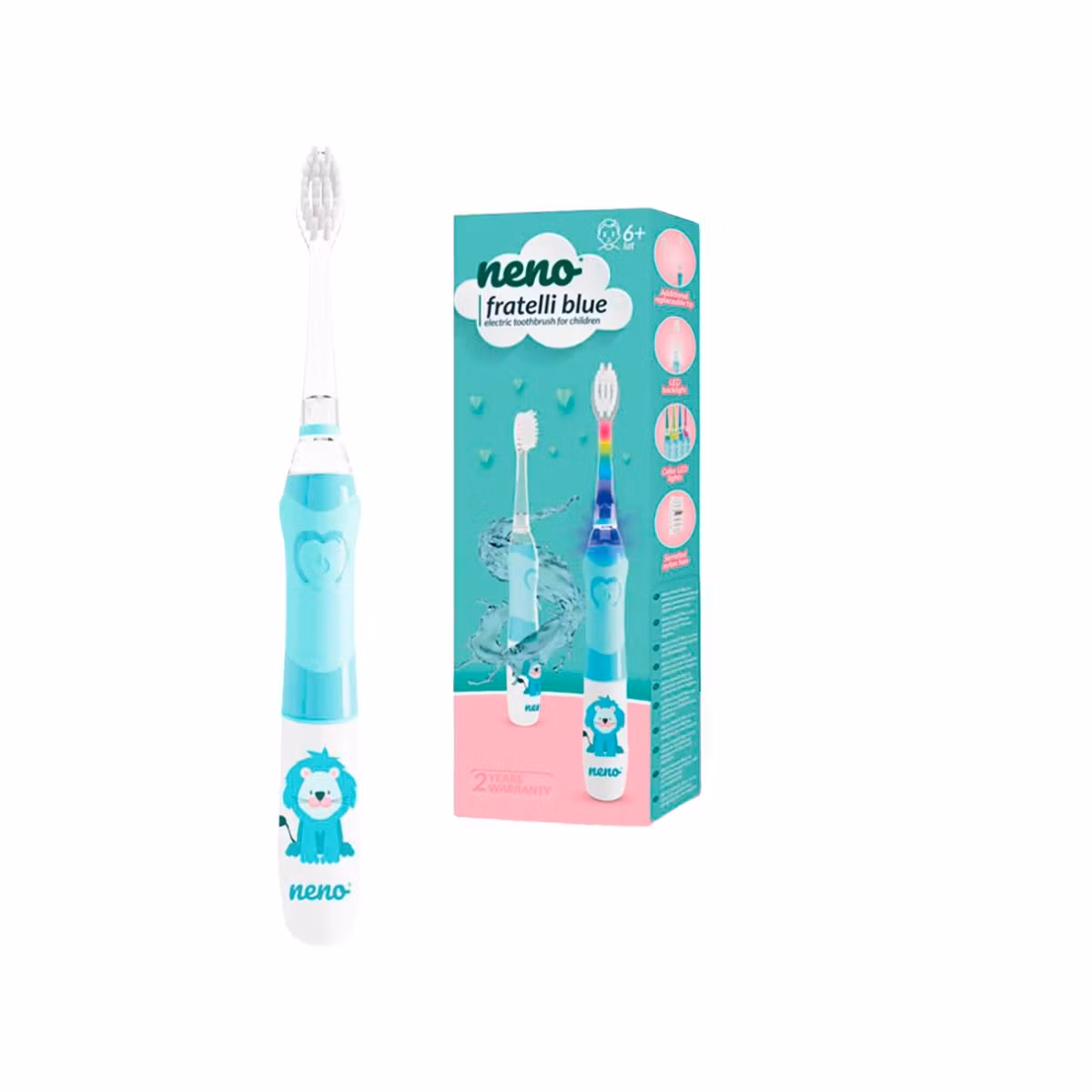 Furçë dhëmbësh elektrike ngjyrë blu për fëmijë 6 vjeç e sipër me kokë me fije najloni të cilat nuk përthithin ujë çka nuk lejon rritjen e mikroorganizmave të dëmshëm. E pajisur me vizatimin në dorezë të luanit, me dritë LED jo vetëm për inspektimin e kavitetit oral, por edhe për argëtim për fëmijët. Pajisur me kohëmatës që ndihmon fëmijën të mësojë rregullin 2 minuta të larjes së dhëmbëve. Furça ndalon çdo 30 sekonda për të kujtuar ndërrimin e zonës që do pastrohet. Furçat janë rezistente ndaj ujit, mund të lahen pa frikë nën rrjedhën e ujit. Nëse ju gjenden koka të tjera të linjës së furçave Neno në shtëpi, mund ti ndërroni sipas dëshirës dhe nevojës. Në paketim gjendet dhe një kokë tjetër zëvendësuese.