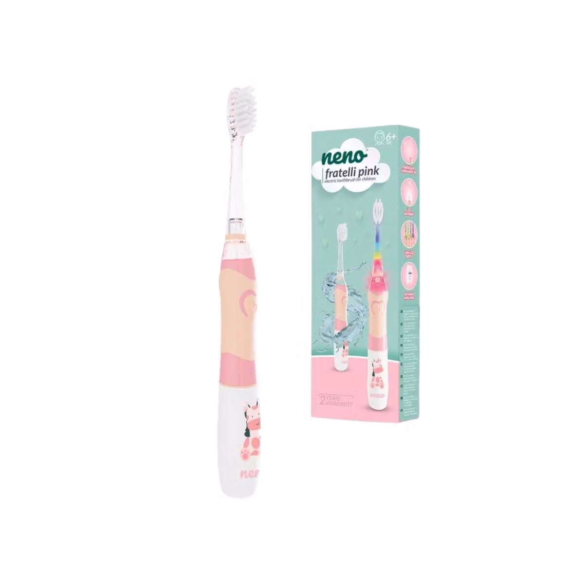 Furçë dhëmbësh elektrike ngjyrë rozë për fëmijë 6 vjeç e sipër me kokë me fije najloni të cilat nuk përthithin ujë çka nuk lejon rritjen e mikroorganizmave të dëmshëm. E pajisur me vizatimin në dorezë të gjirafës, me dritë LED jo vetëm për inspektimin e kavitetit oral, por edhe për argëtim për fëmijët. Pajisur me kohëmatës që ndihmon fëmijën të mësojë rregullin 2 minuta të larjes së dhëmbëve. Furça ndalon çdo 30 sekonda për të kujtuar ndërrimin e zonës që do pastrohet. Furçat janë rezistente ndaj ujit, mund të lahen pa frikë nën rrjedhën e ujit. Nëse ju gjenden koka të tjera të linjës së furçave Neno në shtëpi, mund ti ndërroni sipas dëshirës dhe nevojës. Në paketim gjendet dhe një kokë tjetër zëvendësuese.