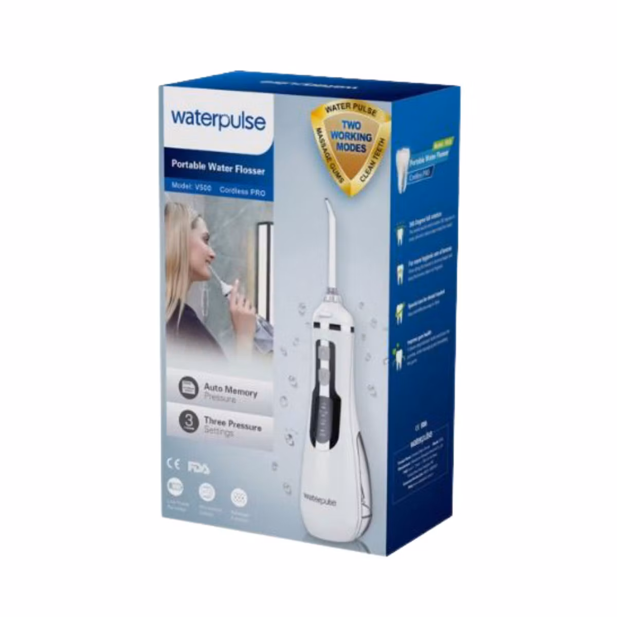 Waterpulse Water Flosser V500 është një pajisje moderne për higjienën orale që përdor një rrjedhë të fuqishme uji me pulsime për të pastruar në mënyrë efektive hapësirat ndërmjet dhëmbëve dhe nën vijën e mishrave, aty ku furça dhe filli tradicional shpesh nuk arrijnë. Falë teknologjisë së presionit të rregullueshëm dhe disa mënyrave të pastrimit, kjo pajisje përshtatet me nevojat e ndryshme të përdoruesve, duke ofruar një pastrim të thellë dhe një efekt masazhues për mishrat që ndihmon në përmirësimin e qarkullimit dhe reduktimin e irritimit. Dizajni pa kabllo dhe rezervuari praktik e bëjnë të lehtë për përdorim në shtëpi apo gjatë udhëtimeve, ndërsa performanca e saj ndihmon në eliminimin e deri në 99.9% të pllakës bakteriale dhe në përmirësimin e freskisë së frymëmarrjes. E rekomanduar edhe për persona me aparate dentare, implante apo kurora, Waterpulse V500 është një zgjidhje e avancuar për një rutinë të plotë dhe efektive të kujdesit oral.