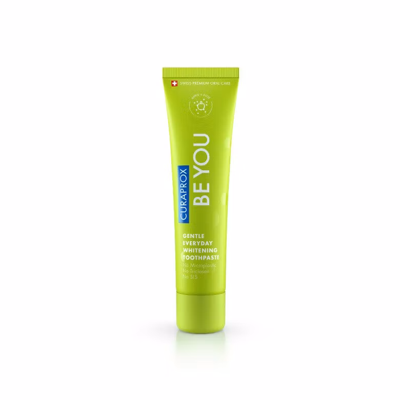 Curaprox Be You një pastë dhëmbësh me Mollës të Gjelbër, Aloe Vera dhe Nenexhik. Falë Enzimave, Hidroksiapatitit dhe Bimëve mbron nga kariesi, ju jep një frymëmarrdhje të freskët, ndihmon kundër ndjeshmërisë, nuk provokon aknet, minimizon pllakat dhe kujdeset për mishrat e dhëmbëve. Efekt zbardhues me Oksidazën e Glukozës. Mbrojtje nga kariesi nga fluori dhe ksilitoli. Mentol jep freski të qëndrueshme dhe Silica bën një pastrim të butë. Provitamin B5 (panthenol).Pa SLS.
