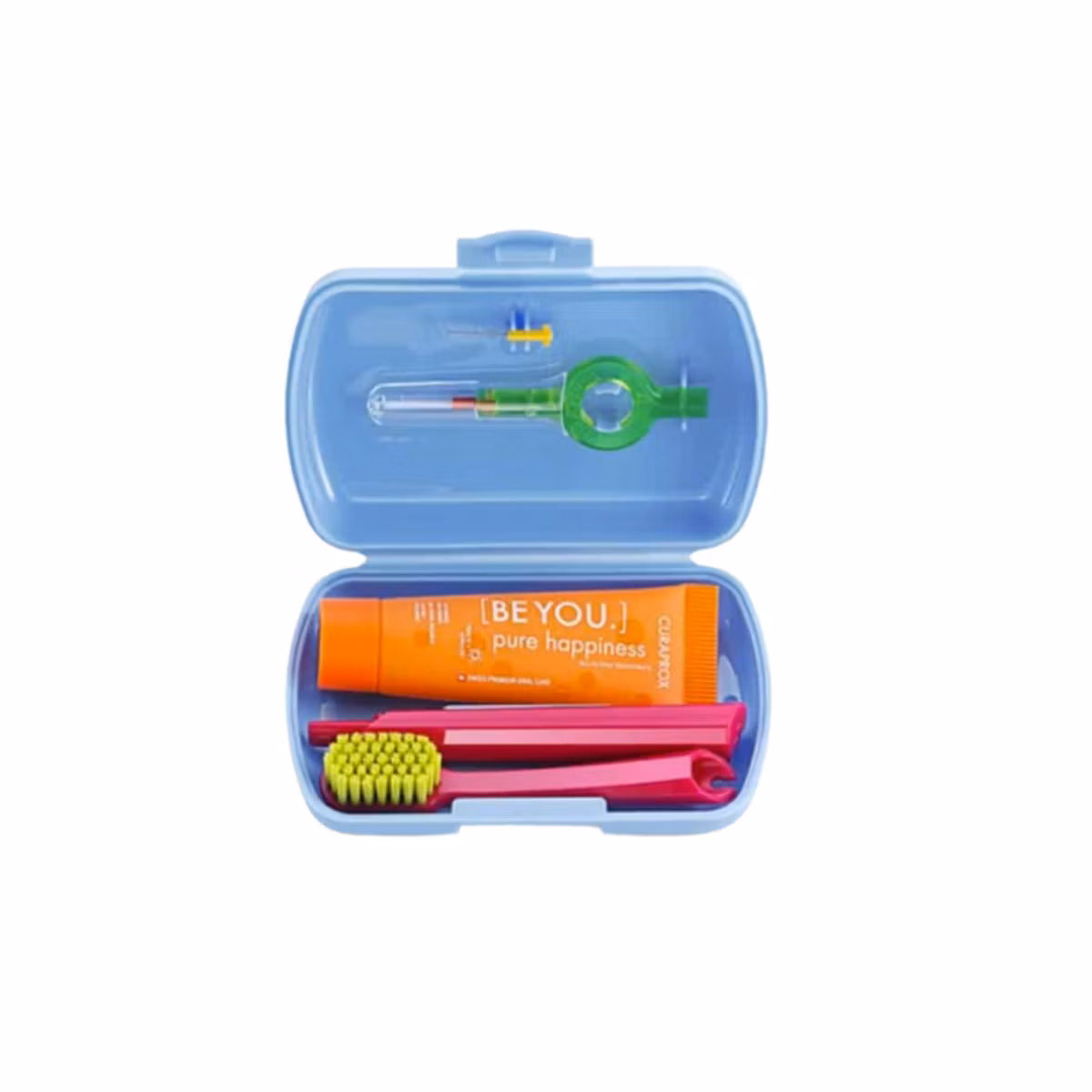 Curaprox Travel Blue Set është seti perfekt i shëndetit oral për të gjitha udhëtimet tuaja. Përmban një furçë dhëmbësh me qime të buta ideale për pastrimin e dhëmbeve. Pastë dhëmbësh Curaprox Be You Pure Happiness Peach + Kajsi 10ml. Mbron dhe kujdeset për dhëmbët dhe mishrat e dhëmbëve. Ndihmon në zbardhjen e dhëmbëve. Gjithashtu seti përmban fill dhëmbësh si kruajtësë që përdoret për të pastruar hapsirat interdentale. Është seti ideal për ruajtjen e higjeës tuaj orale. Seti i udhëtimit ka përmasa ka përmasa vetëm 9,5 cm x 6 cm.