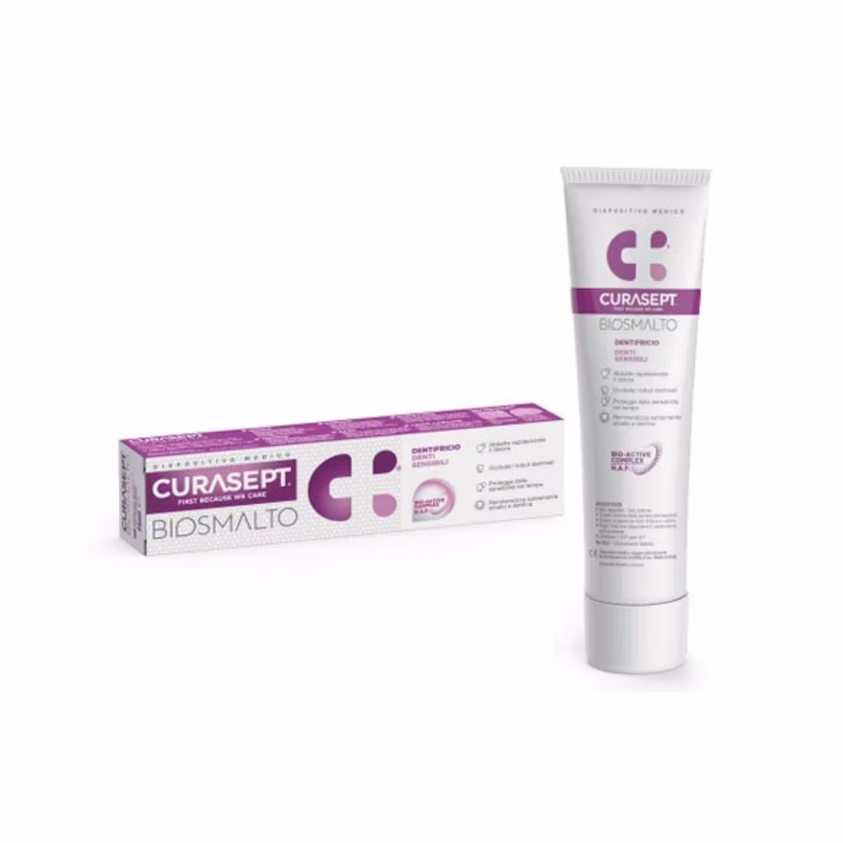 Curasept Biosmalto Teeth Sensitive është një pastë dhëmbësh që vepron duke lehtësuar dhimbjen në rast të ndjeshmërisë së fortë dentine. Veçanërisht dhëmbët e predispozuar ndaj lezioneve kariese, erozionit dhe gërryerjes së smaltit dhe dentinës. Pasta e dhëmbëve Curasept Biosmalto për dhëmbë të ndjeshëm mbyll tubulat dentinale. Me kalimin e kohës përdorimi i pastës rimineralizon smaltin dhe dentinën.