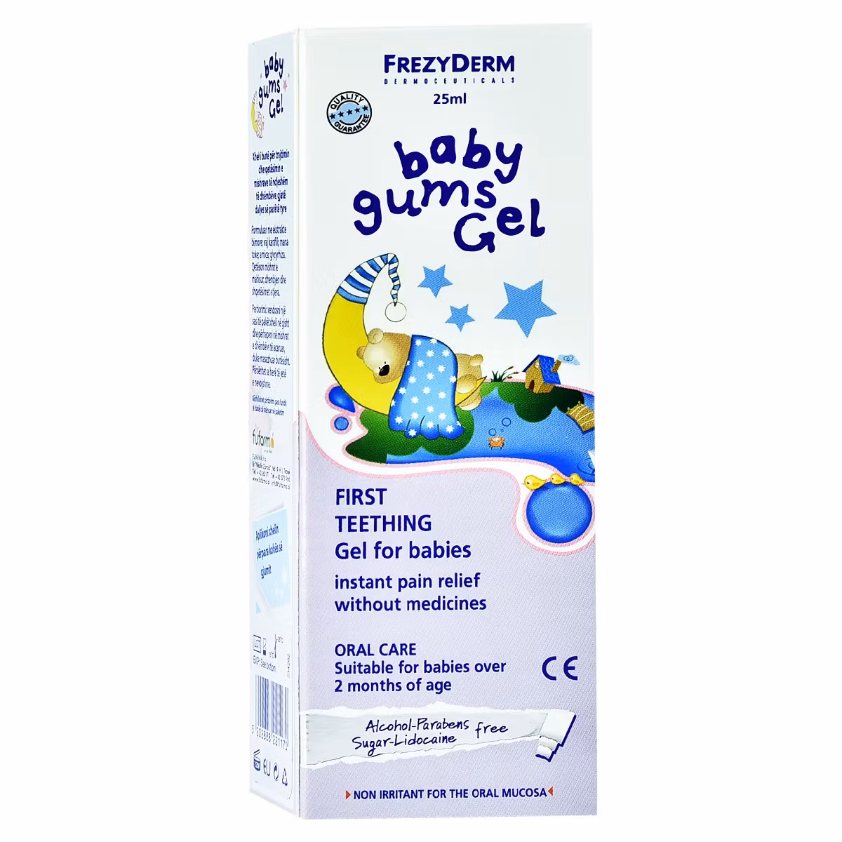 Frezyderm Baby gums Gel është një xhel për mishrat e dhëmbëve me ekstrakte bimore dhe vajra i përshtatshëm për foshnjet gjatë periudhës së daljes së dhëmbëve. Qetëson irritimin dhe pakëson dhimbjen. Rritja e sekretimit të pështymës dhe inflamacioni pakësohen dhe foshnja ndihet e qetësuar.