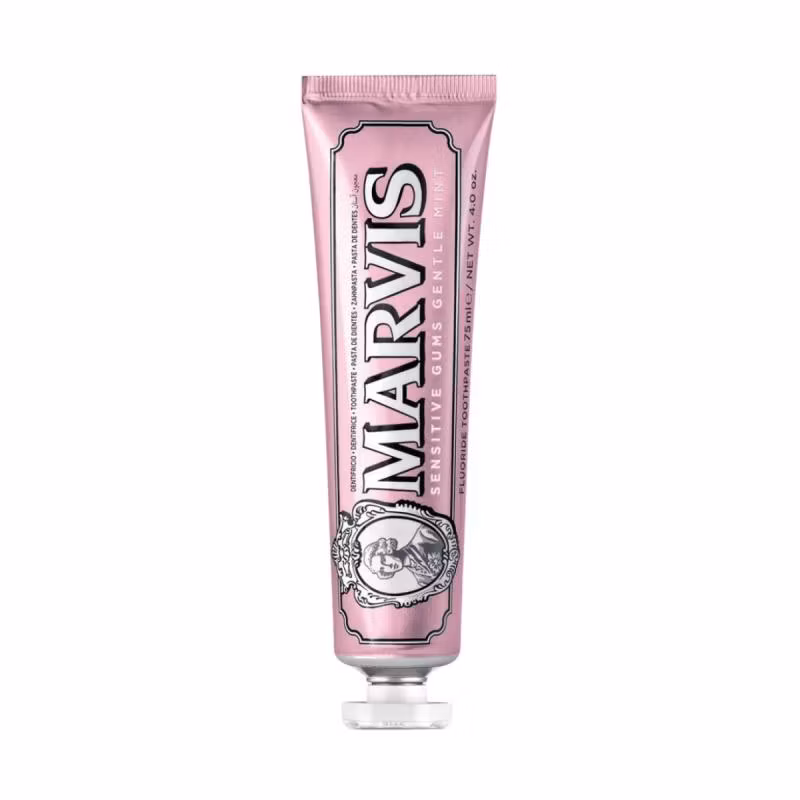 Marvis Sensitive Gums Gentle Mint Toothpaste është një pastë dhëmbësh e formuluar posaçërisht për mishra të ndjeshëm, që ofron pastrim të butë dhe mbrojtje të avancuar. Me një aromë të freskët mente, ajo qetëson ndjeshmërinë e mishrave dhe ndihmon në parandalimin e irritimeve të përditshme. Formula e saj pa sulfate është e pasur me përbërës aktivë që ndihmojnë në forcimin e smaltit dhe ruajtjen e një ekuilibri të shëndetshëm oral. Ideale për përdorim të përditshëm, kjo pastë kombinon kujdesin delikat me freskinë klasike që karakterizon markën Marvis.