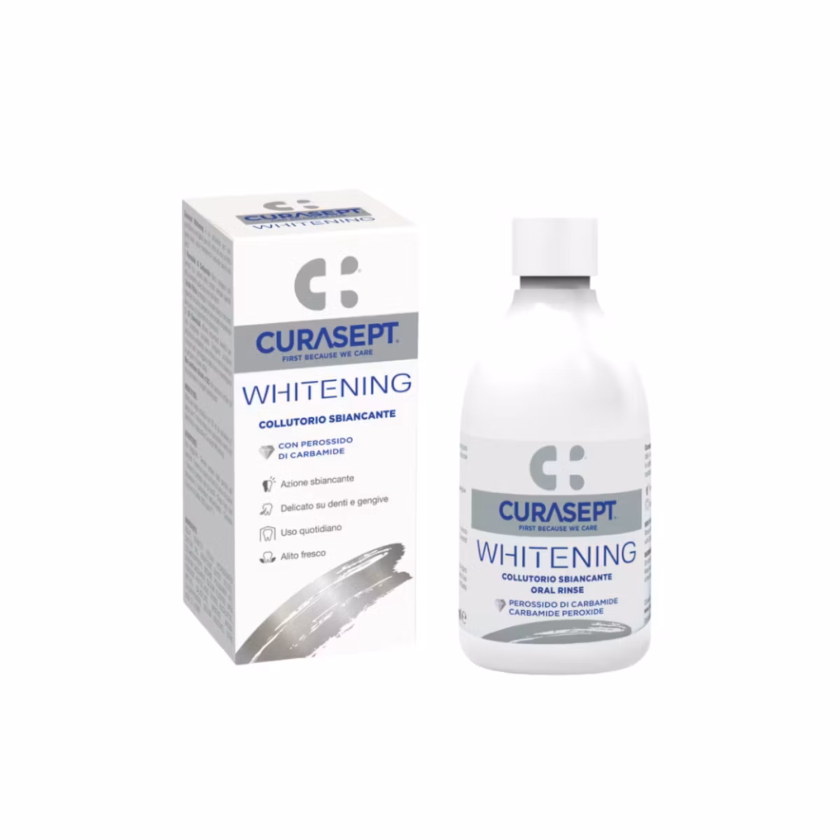 Curasept Whitening është një shpëlarës me Peroksid karbamidi që ndihmon në ruajtjen e bardhësisë natyrale të dhëmbëve. Ndërhyn në të gjithë sipërfaqen e dhëmbit duke ruajtur plotësisht dhe për një kohë të gjatë bardhësinë. Forcon smaltin e dhëmbëve. Parandalon gurët dhe sëmundjet e mishrave të dhëmbëve. Vajrat esencialë në përmbajtje ofrojnë përfitime të rëndësishme për mbrojtje të plotë dhe kryejnë një veprim kundër pllakës dhe halitozës. Lufton erën e keqe të gojës. Mbron thellësisht dhëmbët, mishrat dhe zgavrën e gojës.