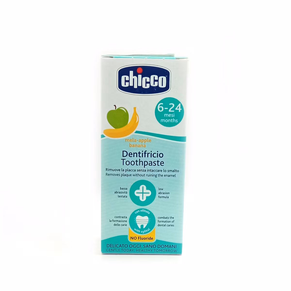 Pastë dhëmbësh banane Chicco është pastë dhëmbësh me shije banane që përdoret për higjienën e përditshme të gojës tek fëmijët. Përmban kalçium dhe ksilitol të cilat janë të rëndësishme në formimin e duhur të dhëmbëve dhe mbrojtjen kundër kariesit. Eshtë ideale për higjienën e përditshme orale të fëmijëve nga 6 muaj deri 5 vjeç.