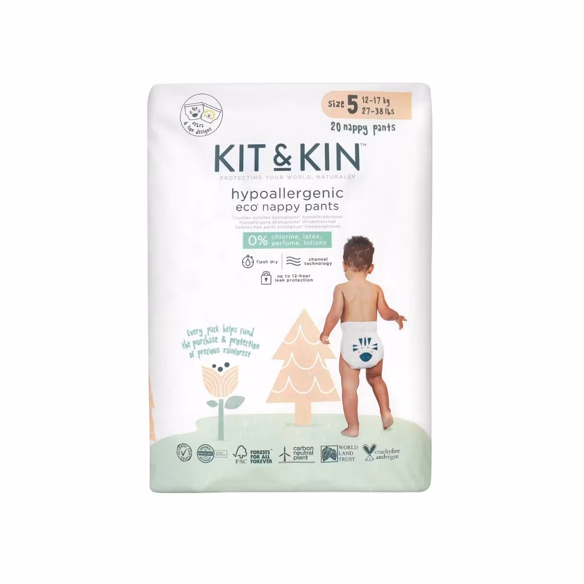 Pelena në trajtë mbathjesh super thithëse, hipoalergjike dhe të qendrueshme nga Kit & Kin vijnë në madhësi të ndryshme sipas peshës dhe me dizenjo të ndryshme të kafshëve. Të përshtatshme për bebat me peshë 12-17 Kg me 20 copë. Eko pelenat më të akredituara në treg të testuara dermatologjikisht, të certifikuara për alergji. Shtresa e thatë thith menjëherë lagështinë duke e mbajtur beben në rehati. Pelenat janë pa përmbajtje karboni. Materiali I jashtëm dhe I brendshëm janë 100% të qendrueshëm, si dhe pjesa mbërthyese te këmbët është e sigurtë ndaj rrjedhjeve. Shtresa absorbuese është nga materiale plotësisht të certifikuara FSC, pa klor dhe SAP.