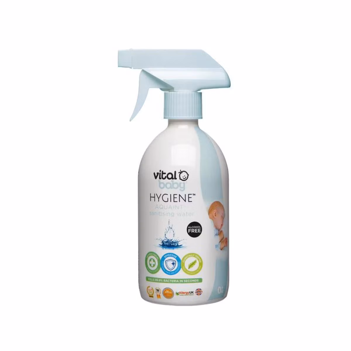 I përshtatshëm për përdorim nga lindja, uji higjenizues është 100% natyral, pa përmbajtje alkooli dhe aromash, ai vret 99.9% të baktereve brenda pak sekondave. Nuk ka nevojë të shpëlahet. I sigurtë edhe në rast se gëlltitet padashje. Përmban vetëm një ingredient tjetër, një acid natyral i cili prodhohet nga vetë trupi i njeriut për të luftuar bakteret dhe mikrobet dhe gëzon veti antibakteriale. Nuk lë mbetje.
