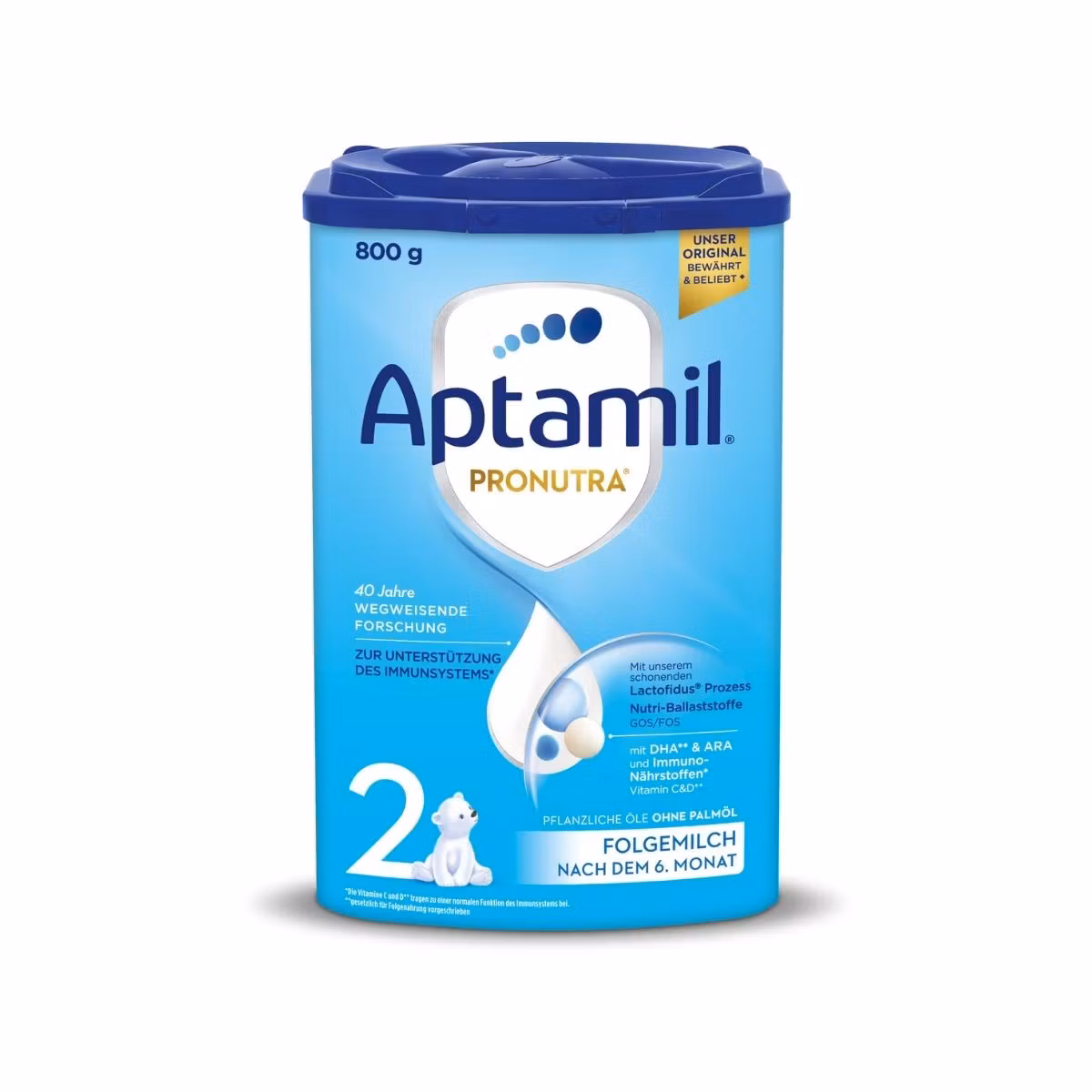 Aptamil 2 është një qumësht formulë e pasur me Omega-3 LCP, Hekur, Vitamina A, C, D dhe GOS/FOS & 3’-GLI përshtatshëm për fëmijë nga 6 deri në 12 muaj. për të mbështetur rritjen e fëmijës dhe për të plotësuar nevojat ushqimore. Vitamina D është e rëndësishme për zhvillimin e kockave dhe rritjen e imunitetit. Hekuri ndihmon në funksionin dhe zhvillimin normal të trurit.
