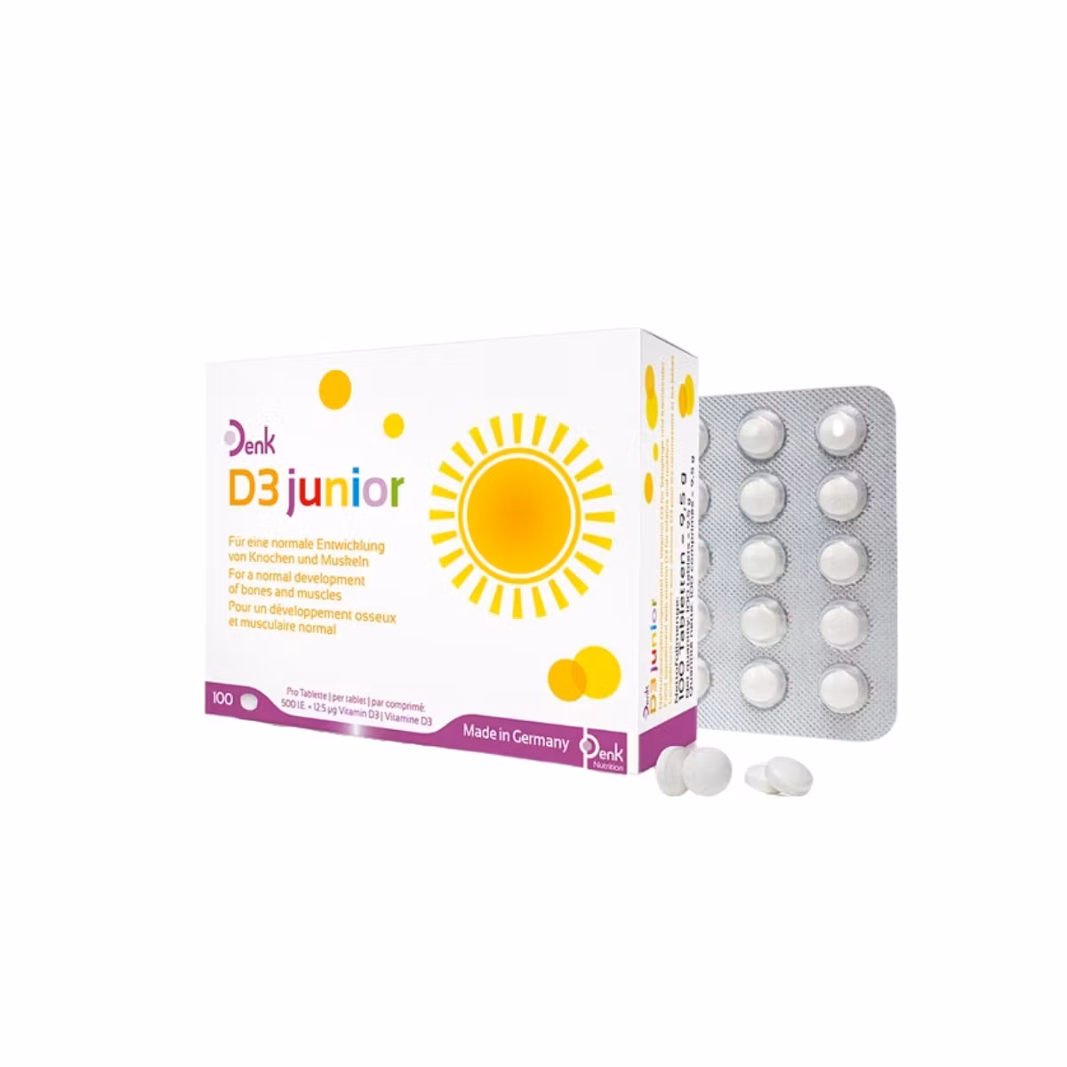 Denk D3 Junior është suplement për fëmijë që përmban vitaminë D. Vitamina D ndihmon në zhvillimin normal të kockave dhe dhëmbëve. Ruan funksionimin e muskujve dhe nervave. Rrit sistemin imunitar. Vitamina D është e rëndësishme për përthithjen dhe përdorimin normal të Kalciumit dhe Fosforit.